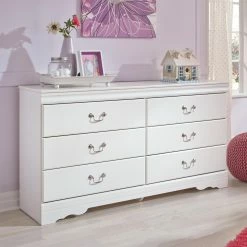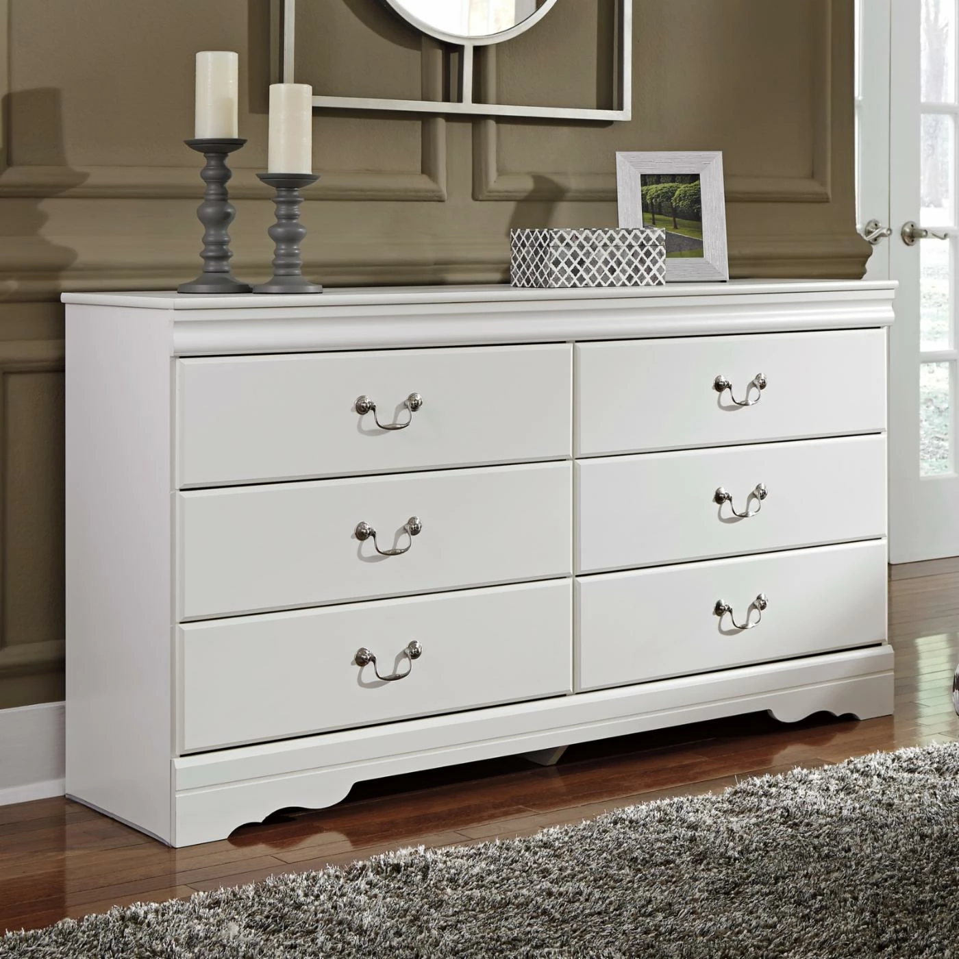 Finished in crisp white, this attractive Signature Design by Ashley Anarasia 6 Drawer Dresser with Optional Mirror adds cottage charm to your bedroom. Sturdily built, this dresser features six side-by-side drawers with side roller glides for smooth operating. Details include antique pewter-tone metal hardware, a curvaceous footboard panel and shapely Louis base molding. The matching mirror finishes the dresser set perfectly.
