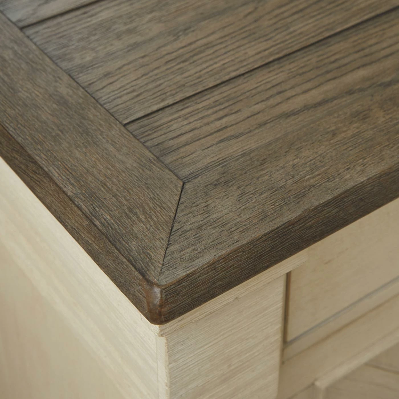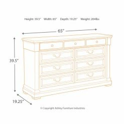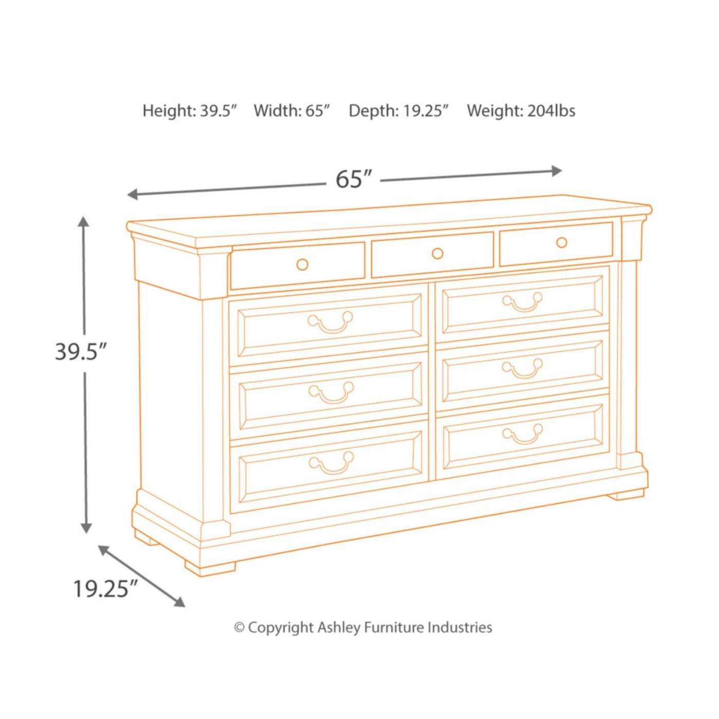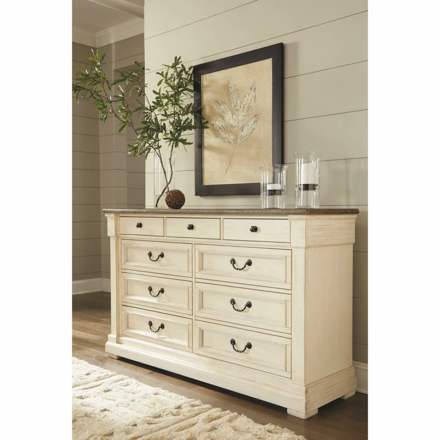 The Signature Design by Ashley Bolanburg 2-Tone 9 Drawer Dresser with square feet delivers charm and a fashionable contrast. The plank-style top features a weathered oak finish and the body is covered in antique white. The three top drawers are lined with felt and have pulls, while the lower six drawers have framed inset panels and braided handles. This dresser is durably designed with a blend of solid wood, engineered wood, and veneers to offer you years of enjoyment.