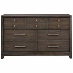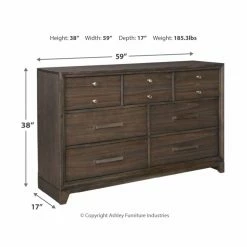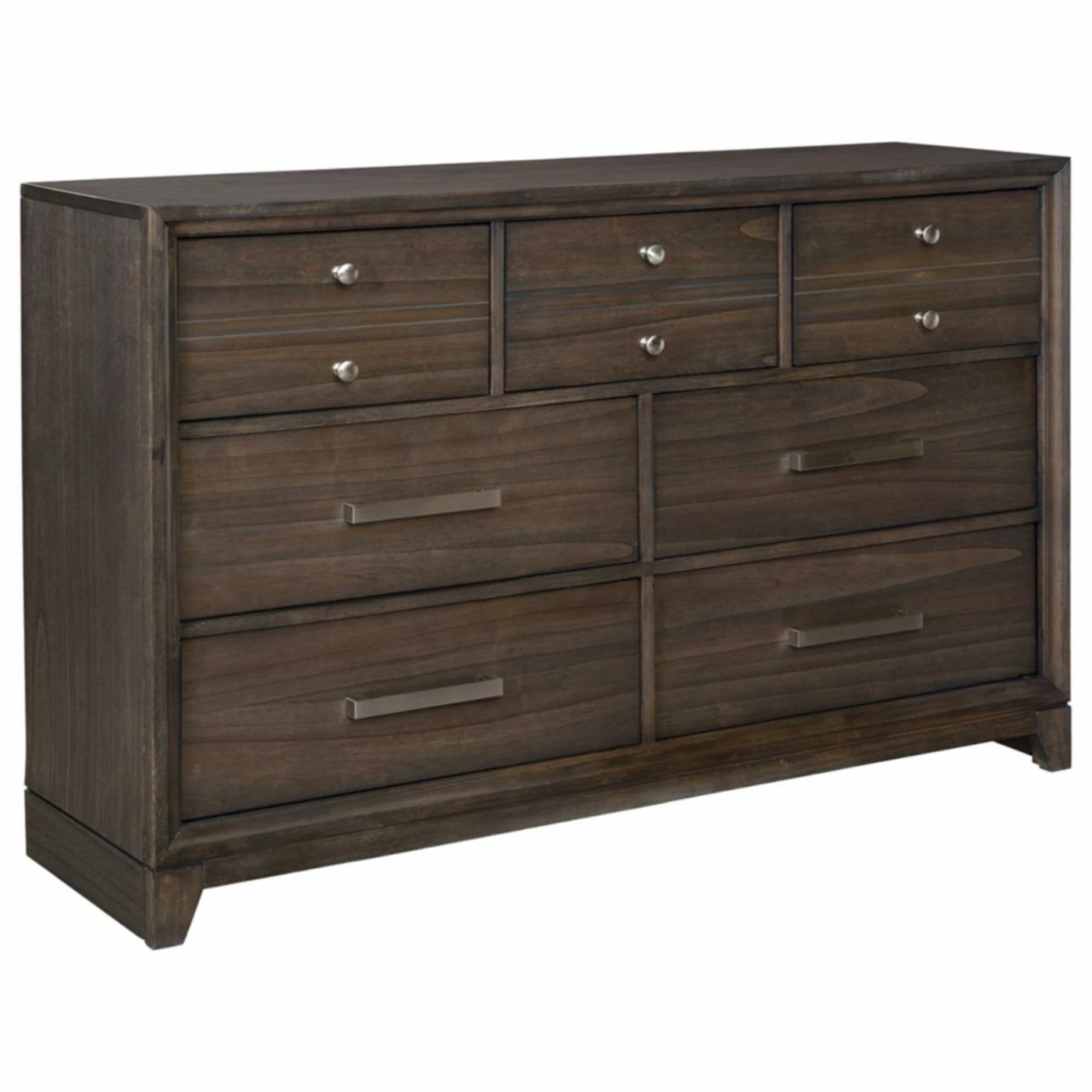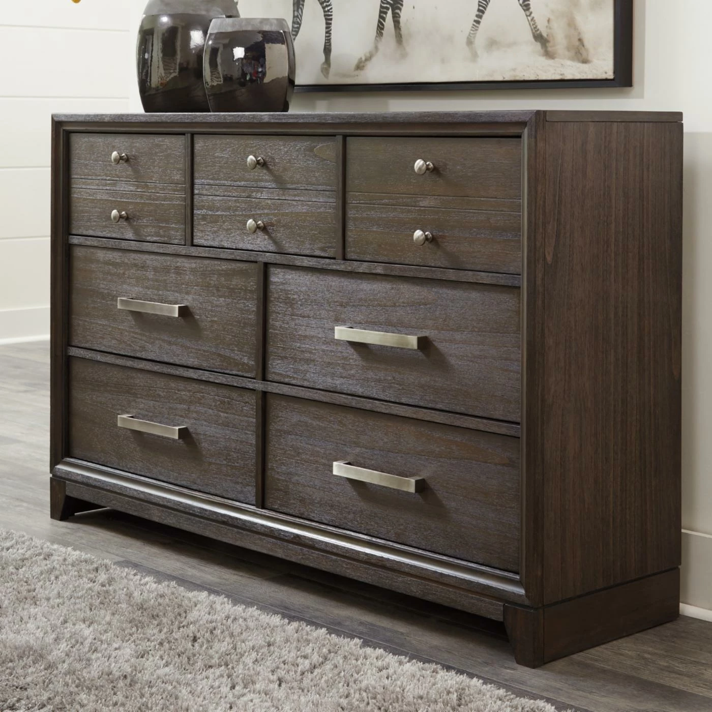 Satisfying your taste for transitional contemporary furniture, the Signature Design by Ashley Brueban 7 Drawer Dresser sports serene sophistication. A wonderfully clean-lined profile is dramatically enriched with a complex, burnished finish and brushed nickel-tone hardware. Seven roomy drawers keep your wardrobe organized in style.