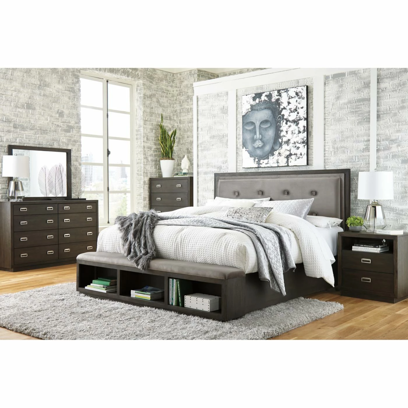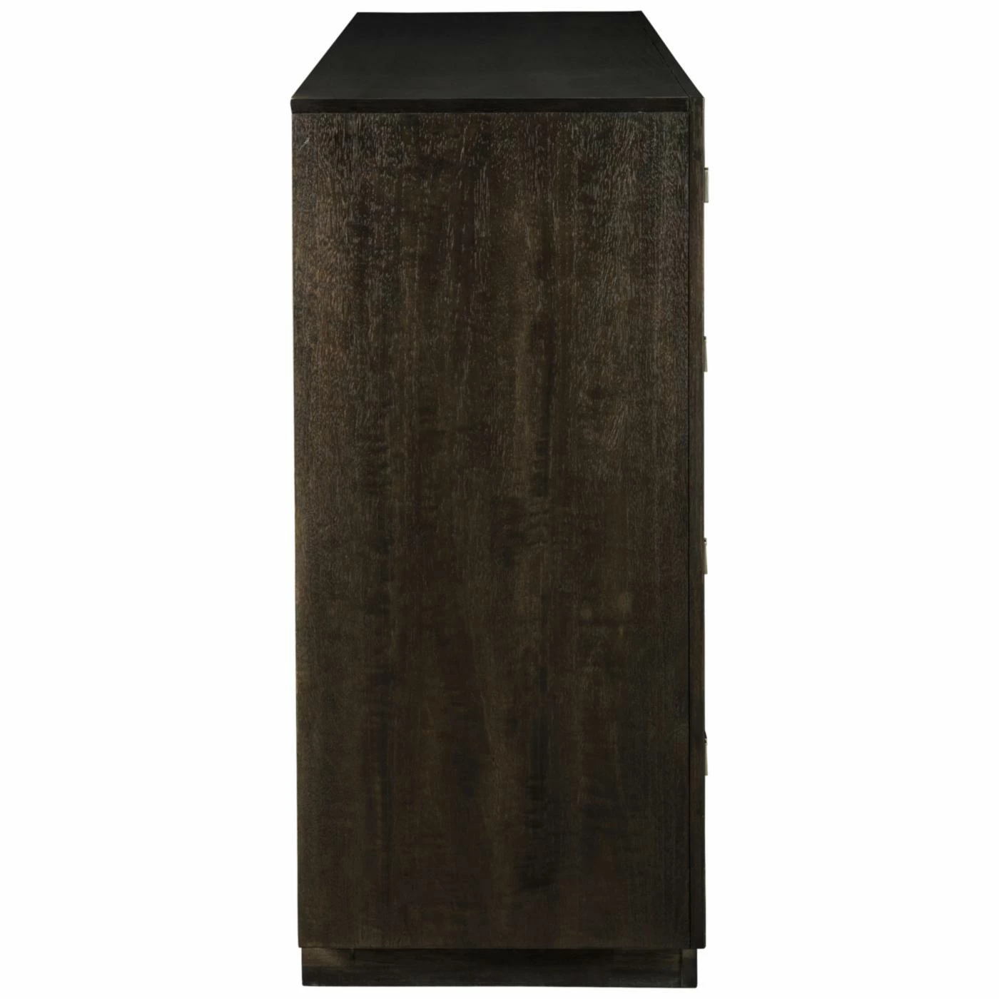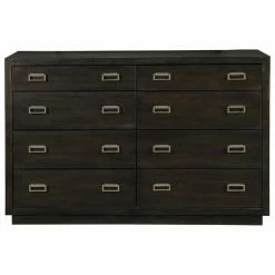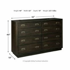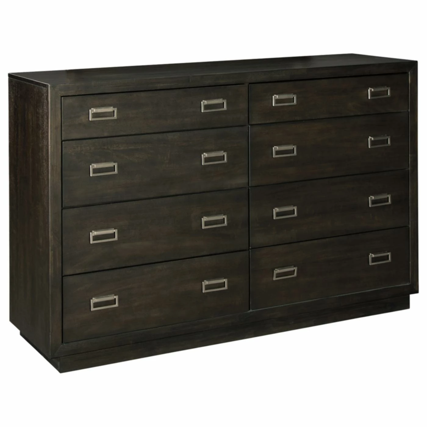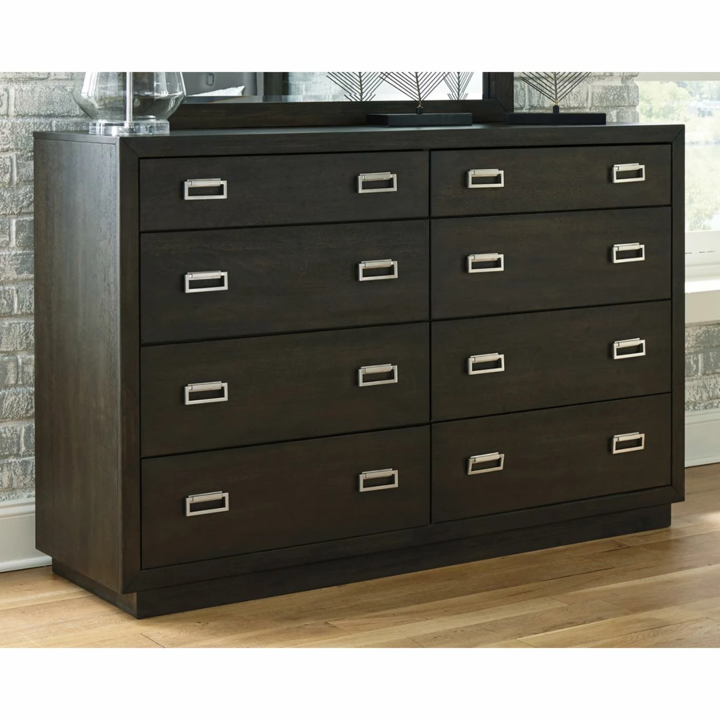 By pairing contemporary design with rich elements, the Signature Design by Ashley Hyndell 8 Drawer Dresser is sure to bring sophistication and a touch of romance to your bedroom. The dresserβs dark espresso finish and bright nickel-tone hardwareβmade even more dramatic with the addition of the modern plinth baseβcomplement the sleek style. Eight smooth-gliding drawers generously accommodate your wardrobe needs.