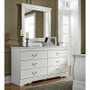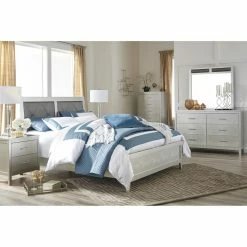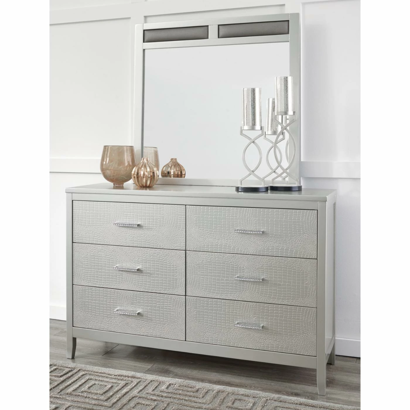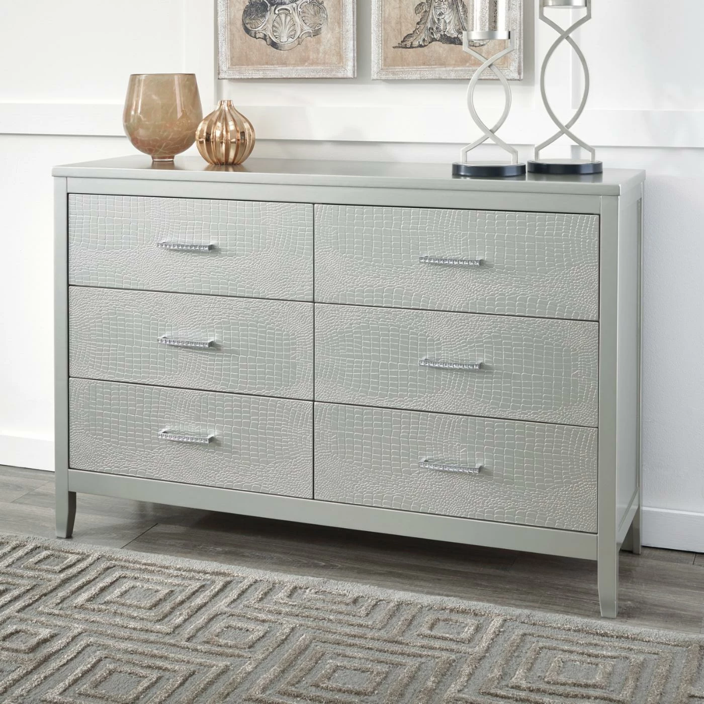 The Signature Design by Ashley Olivet 6 Drawer Dresser with Optional Mirror makes a useful addition to any bedroom. This dresser boasts a sturdy hardwood frame and angled legs. Faux leather and crystal-accented bar pulls adorn the six drawer fronts. The silver finish adds a glamorous touch. An optional mirror with matching wood trim and finish is also available.