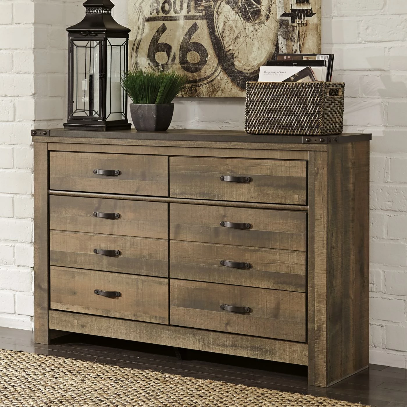 The rustic country charm of the Signature Design by Ashley Trinell 6 Drawer Dresser with Optional Mirror is sure to give your bedroom a unique beauty. The natural finish highlights the replicated wood grain and plank-style construction, creating the look of reclaimed barn wood. Six smooth-glide drawers provide ample storage, while antiqued bronze-toned hardware complements the style. Add the matching mirror to complete the look. Assembly required.