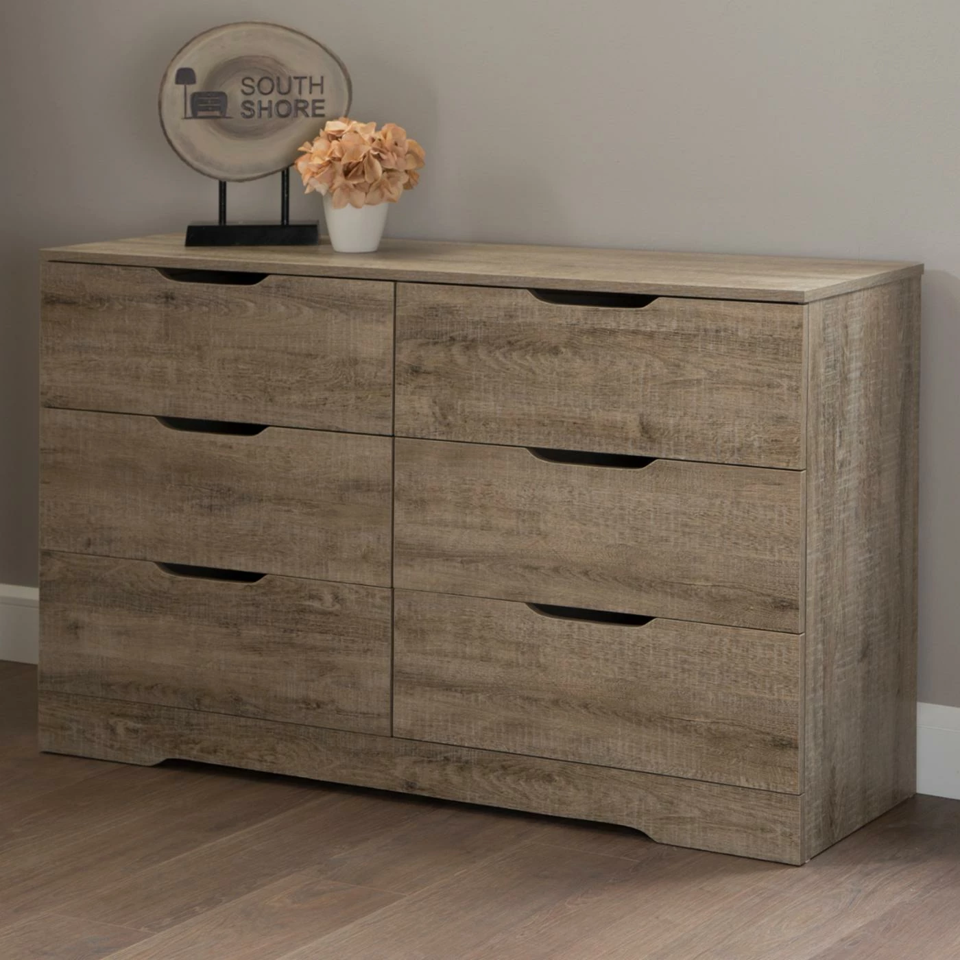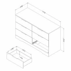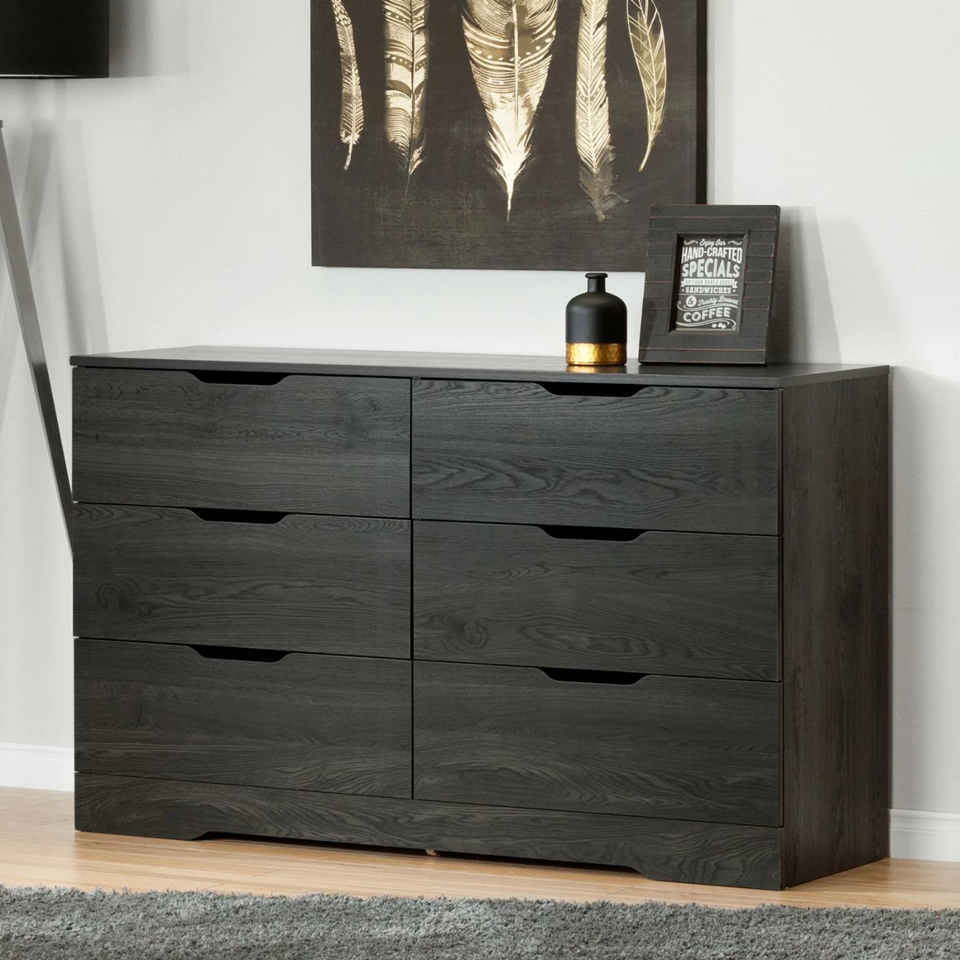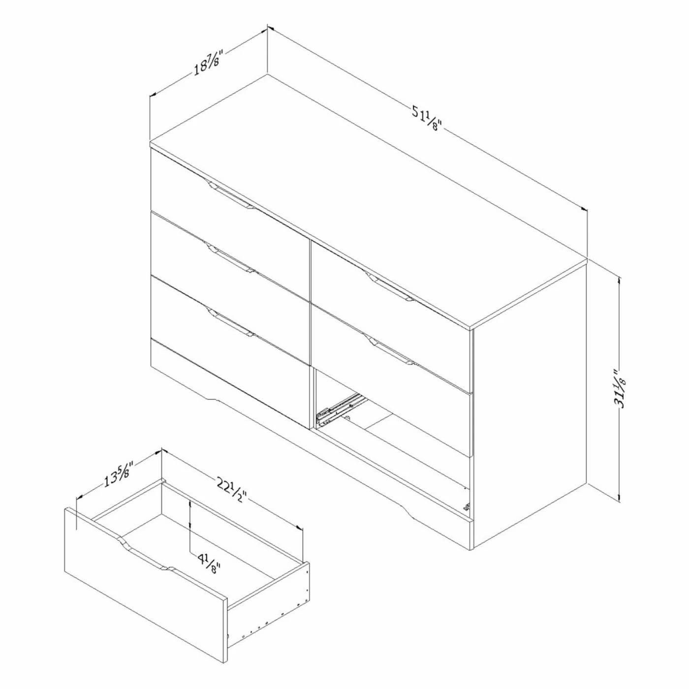 The six side-by-side drawers of the South Shore Holland 6 Drawer Double Dresser are roomy and operate on smooth metal slides. Cut-out handles and clean lines give this dresser its urban appeal. It’s crafted in North America of non-toxic laminated engineered wood and comes in the available finishes.