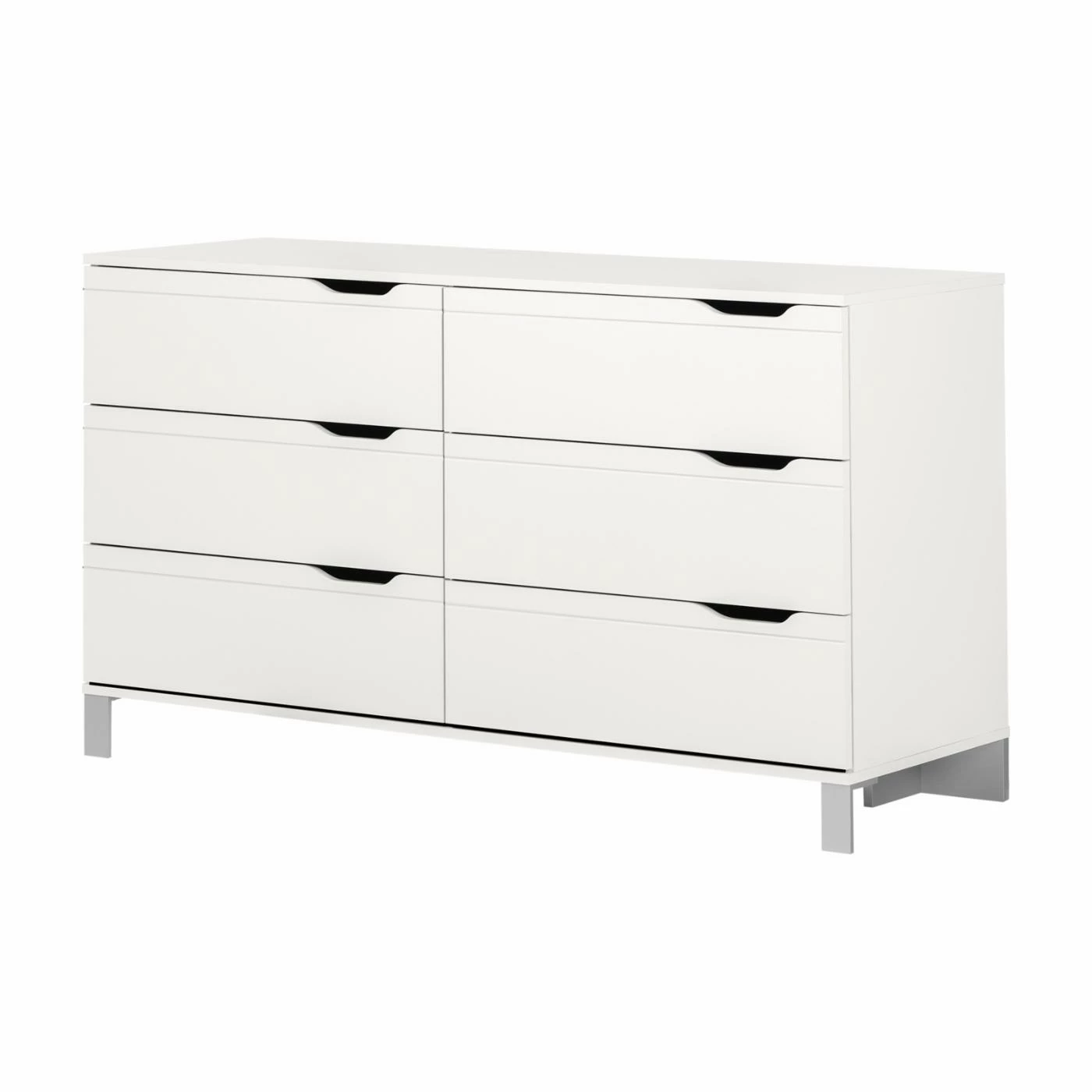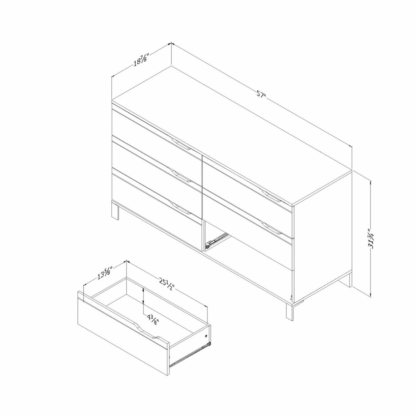 The South Shore Kanagane 6 Drawer Double Dresser will deliver a modern aesthetic to your bedroom décor. This distinctive double dresser features clean lines and six easy glide drawers with cutout pulls that enhance its contemporary look. This dresser is constructed from engineered particleboard and comes in a choice of available finish options, so you can complement your décor.