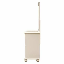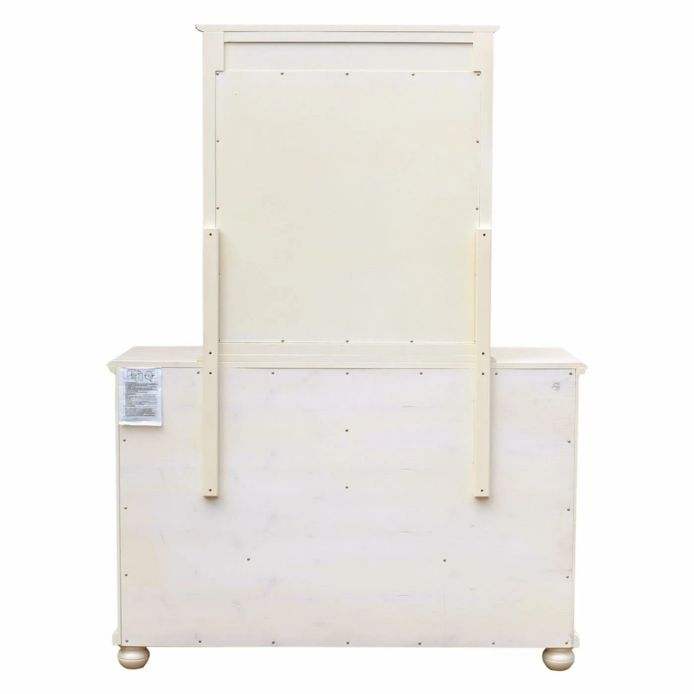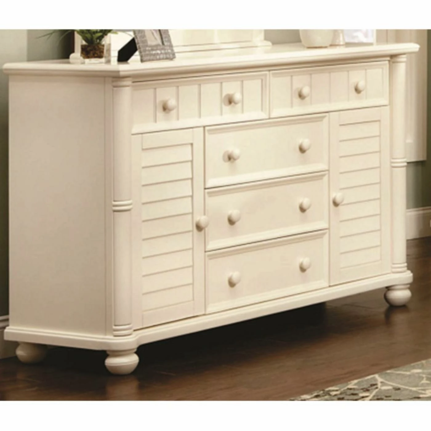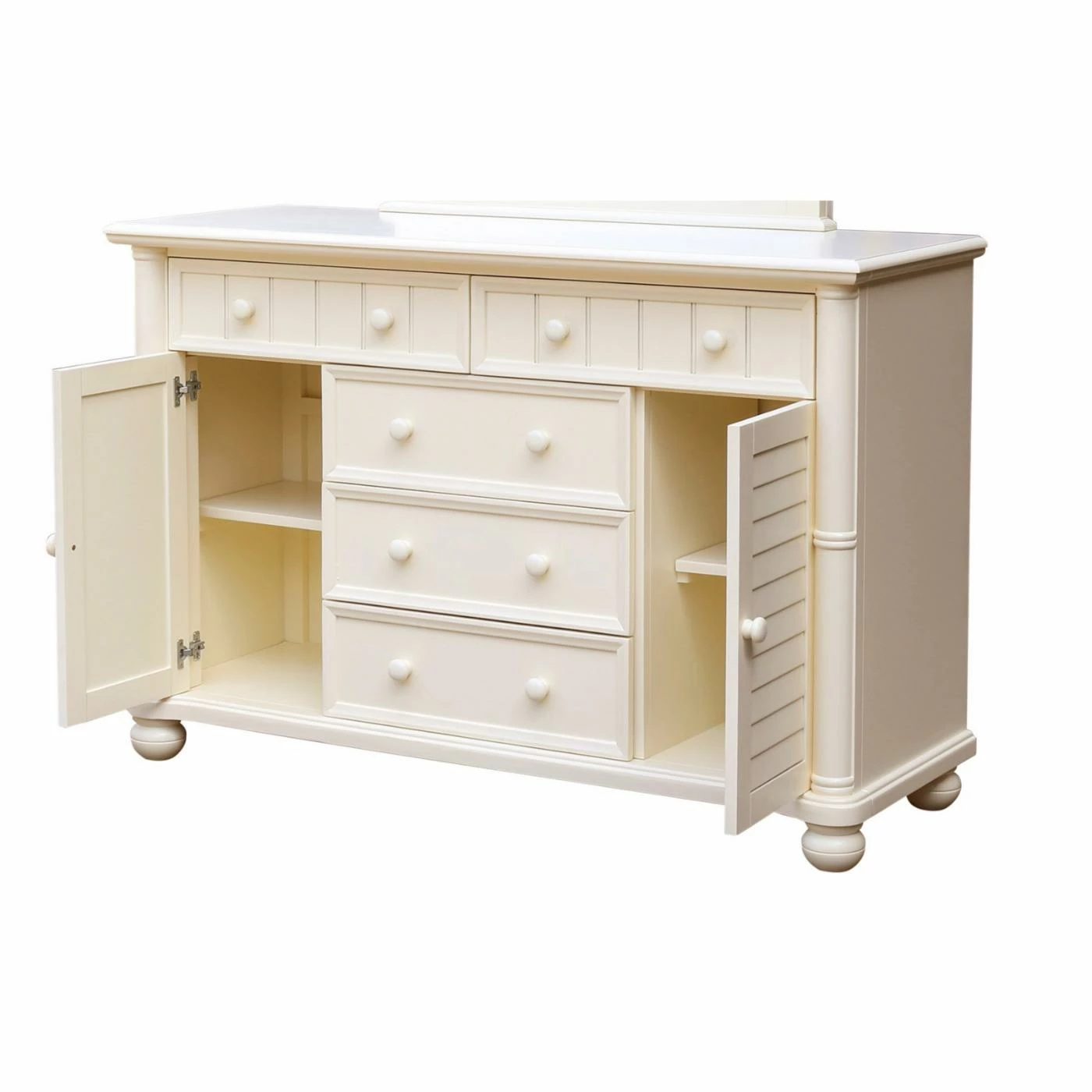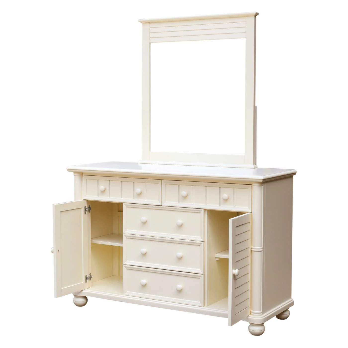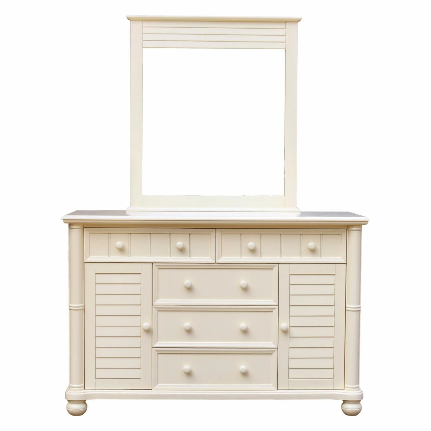 Enjoy generous storage options with cherry-on-the-top-charm from the Sunset Trading Ice Cream At The Beach 5 Drawer Dresser. Featuring five storage drawers with durable dovetail construction and two doors that open to shelving for additional storage, this dresser is perfect for storing clothes, seasonal items, accessories, and more. Shiplap wainscot, beadboard paneling, bamboo-style pillars, and horizontal closed-shutter accenting on each door enchant your bedroom with the island-infused, country-cottage style of the Ice Cream at the Beach Collection. Clean and fresh in Antique White, this dresser is crafted from premium hardwood and engineered wood enhanced with an eight-step finishing process and layered with a smooth coating of protective lacquer. An optional beveled mirror with an angled edge border is available.