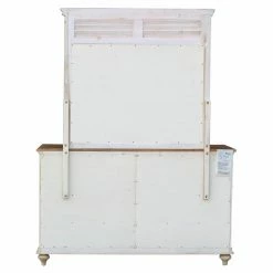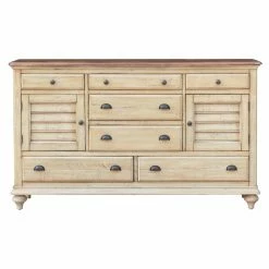 Streamline your storage system with the Sunset Trading Shades Of Sand 7 Drawer Dresser. Stocked with storage options aplenty, this dresser features seven drawers constructed with durable dovetail joinery and two doors that open to additional storage space. To carry through the airy, seaside style of the Shades of Sand Collection, this dresser is accented with an open-louvered design and features an antique white finish wire-brushed by hand for a hint of texture. The natural walnut-finished dresser top coordinates with the light-toned look. This dresser is crafted from acacia wood and New Zealand pine enriched with an eight-step finishing process and layered with a smooth coating of protective lacquer. An optional matching mirror is available to complete this piece.