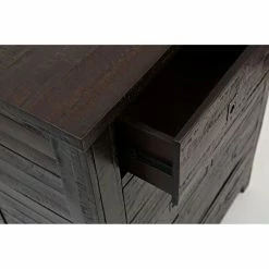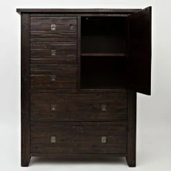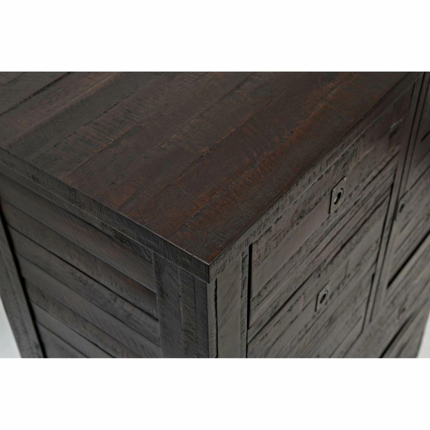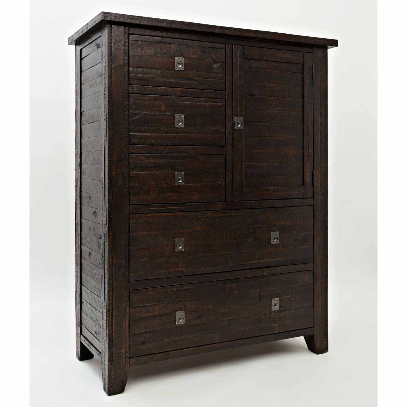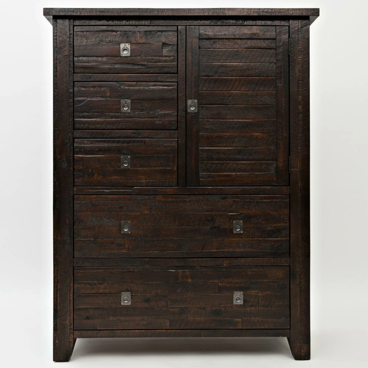 The Jofran Kona Grove 5-Drawer Chest with Door might have the rugged appearance of a piece straight from a mountain man’s reclusive hideaway, but it’s got a fully finished, thoughtful design that is going to make it an easy addition to your space. The body is crafted from solid hardwood with a chocolate-toned finish that gives weight and depth to the hand-worked, semi-primitive texture of the lumber. Five pull-out drawers offer ample storage, and a divided storage compartment rests behind a wide door with a fixed shelf and even more storage. Recessed metal handles accentuate the simple style of this rustic chest.