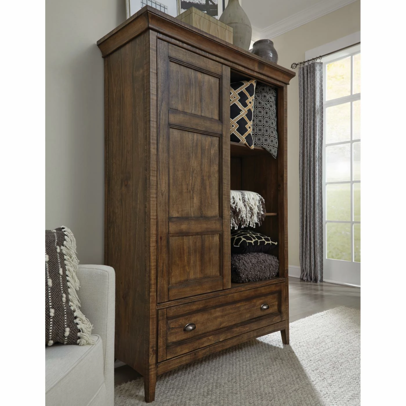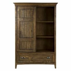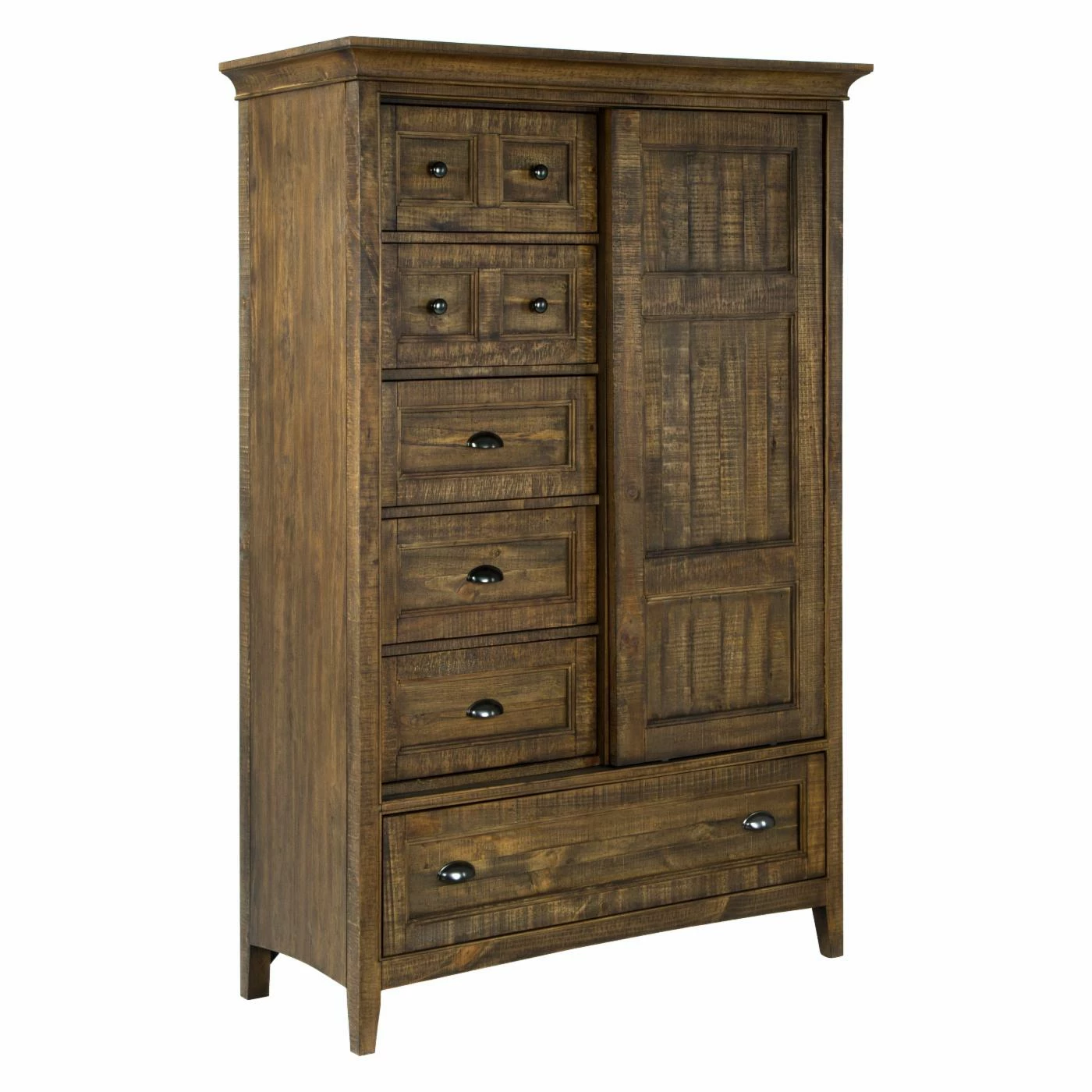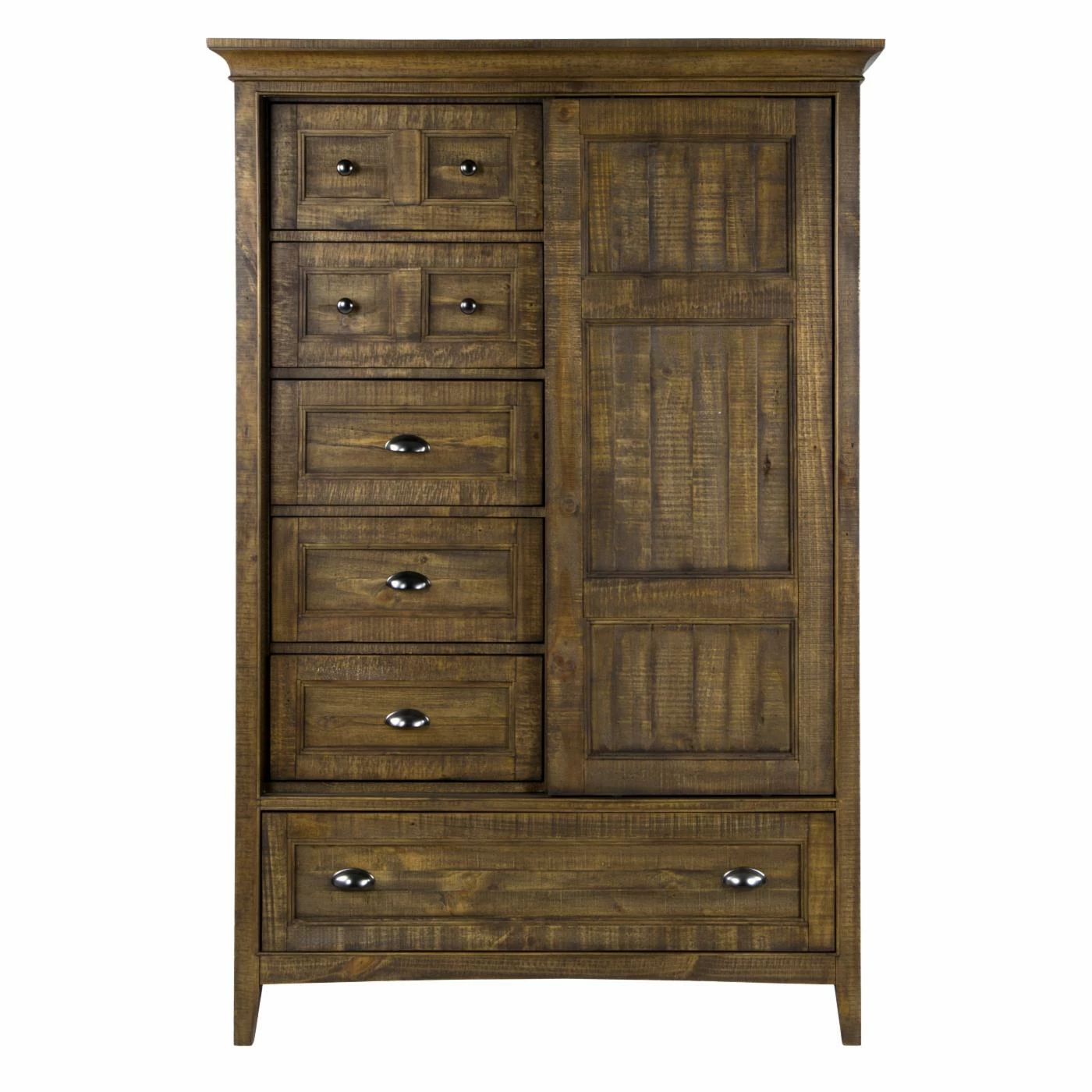 Give any room an abundance of pure rustic style with the Magnussen Bay Creek Relaxed Traditional Toasted Nutmeg Sliding Door Chest, enhanced in a warm toasted nutmeg finish on pine veneers and solids. This incredible chest features a large bottom drawer, 5 side drawers, and a unique sliding cabinet door for more than ample storage. Shaker legs and aged bronze hardware lend it a rich finishing touch.