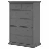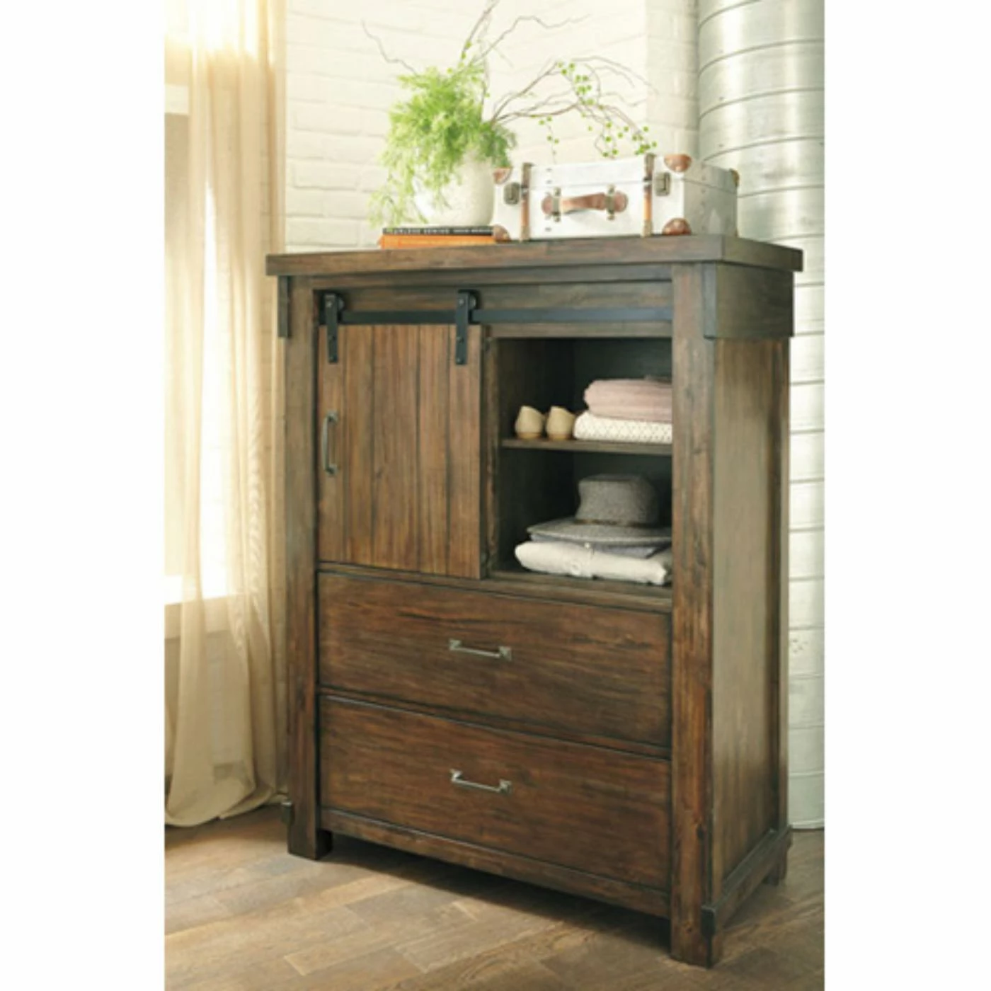With the Signature Design by Ashley Lakeleigh 5 Drawer Chest, you’ll get a unique way to store all your essentials thanks to five spacious drawers and a sliding barn door that reveals two hidden shelves. This rustic chest is crafted with clean, straight lines and features sturdy construction, silver metal hardware, and an inviting rich brown finish.