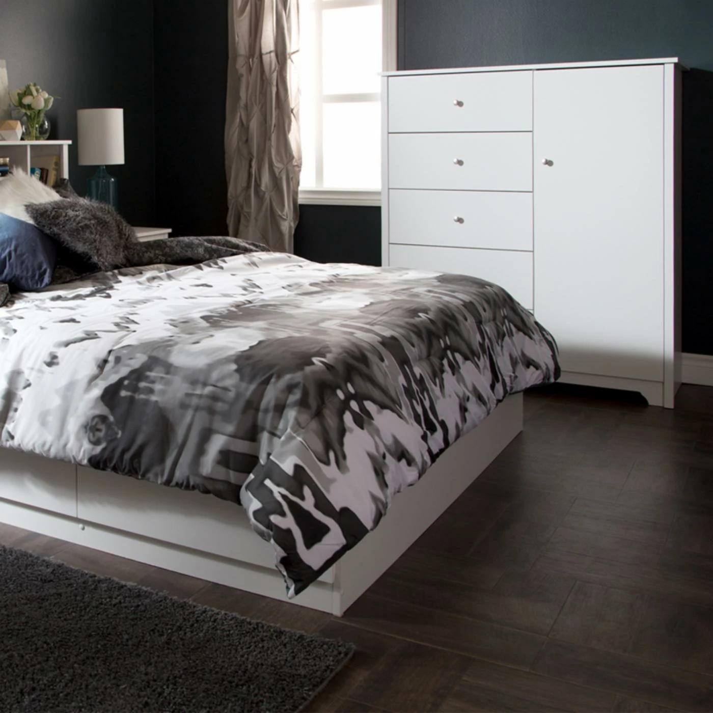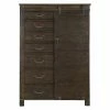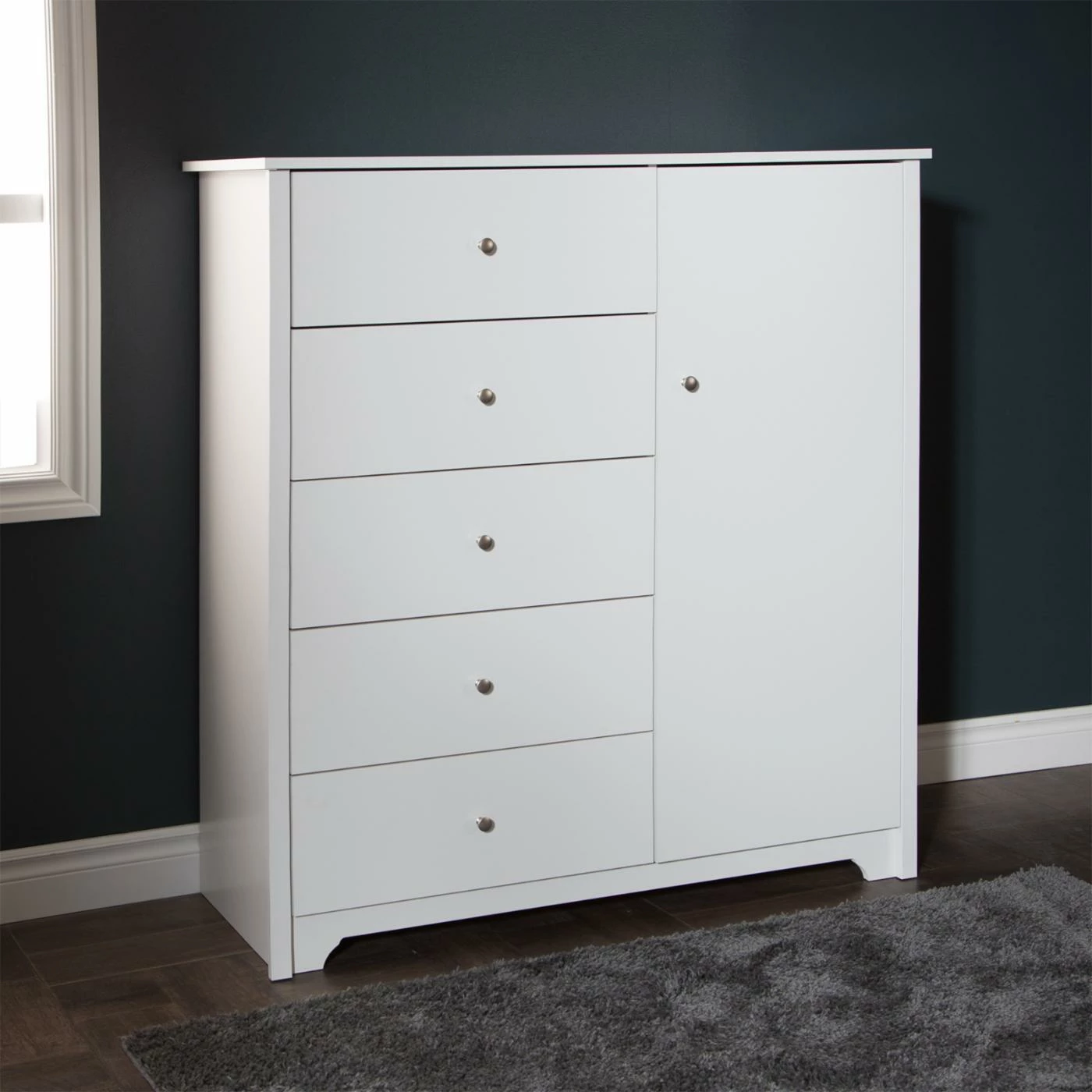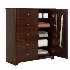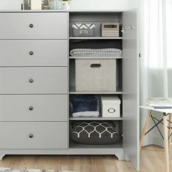 Increase the amount of storage in your bedroom with the smart design of the Vito Door Chest with 5 Drawers by South Shore. On the left side of the durable, engineered wood door chest, you’ll find five storage drawers that glide open and closed easily on metal slides. Open the door to reveal three adjustable shelves and one fixed shelf with five storage spaces for folded clothing and accessories. Two double metal hooks are secured to the inside of the door and are perfect for hanging necklaces, ties, and scarves. A hole in the back of the armoire lets you feed cords through with ease, so you can also use this chest as a television stand if you wish.