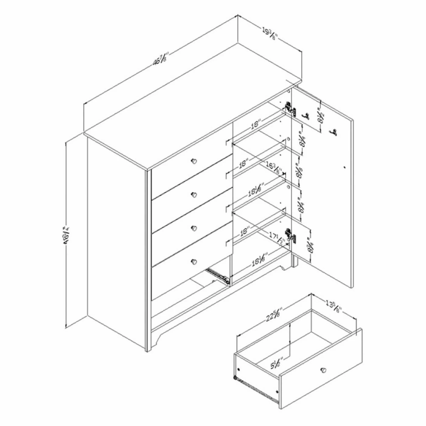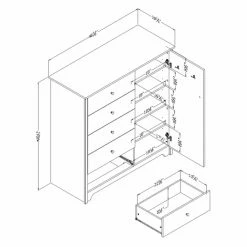 - 5 drawers on left and 4 shelves behind door