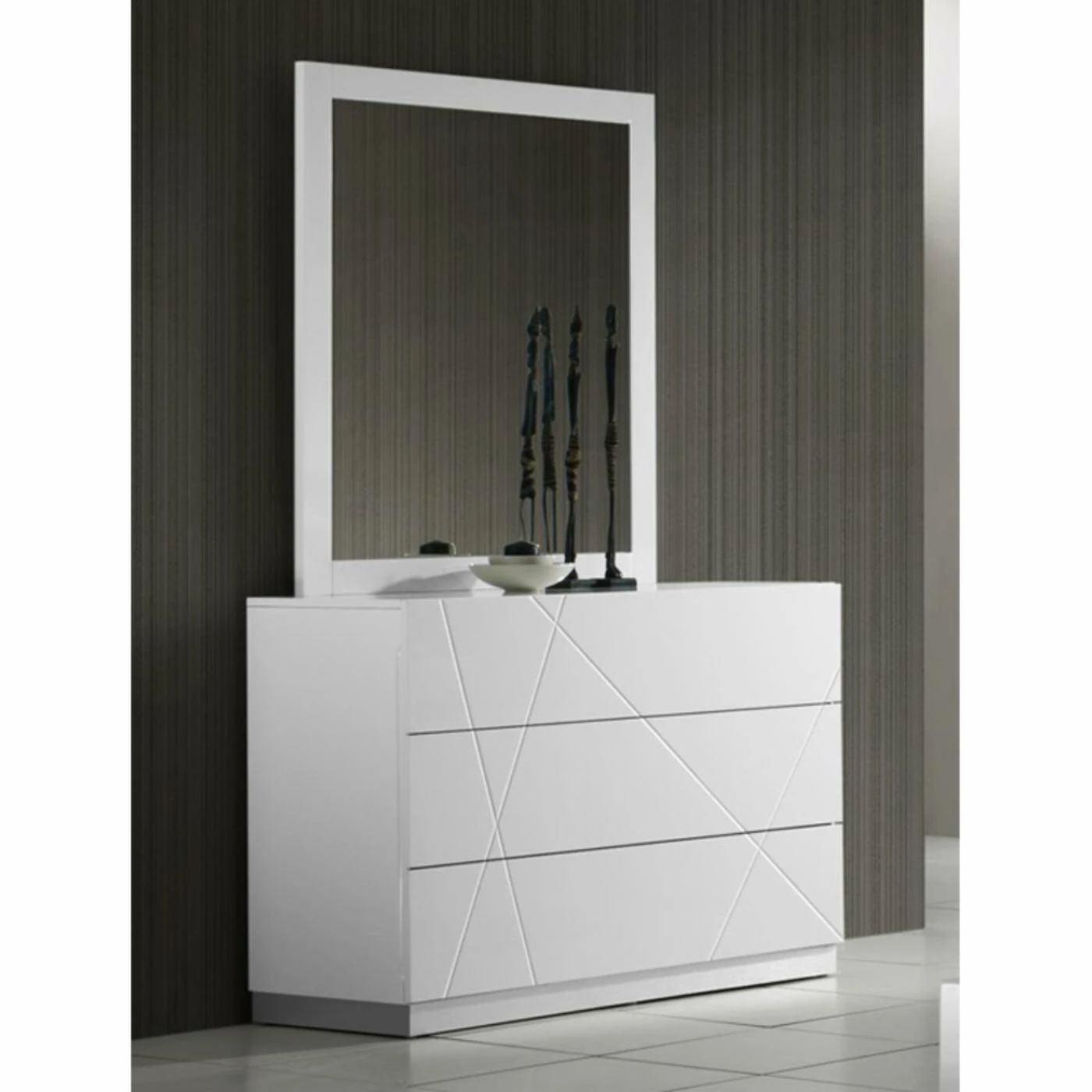 Geometric style lines and a chic white lacquer finish makes the J&M Furniture Naples 3 Drawer Dresser and Mirror a sophisticated addition to your decor. This spacious, three-drawer dresser features subtle metallic accents for an added touch of glamor. The rectangular mirror topping off this dresser reflects your chic style. All of the top-quality wood used to craft this top-quality dresser was harvested from a plantation, making it a rainforest-friendly choice for your decor. Consider pairing this dresser with the other items available within the Naples collection.