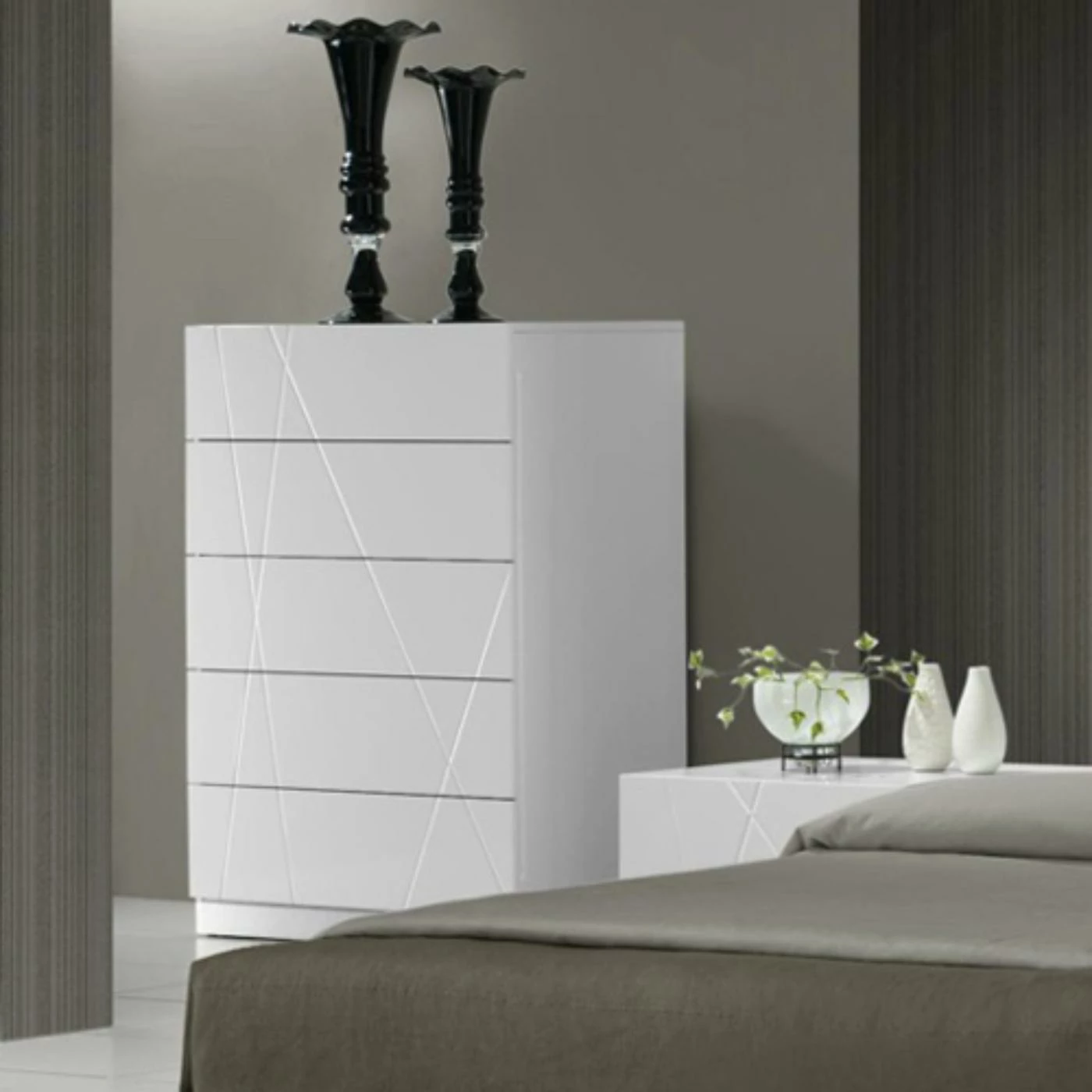 Give your bedroom a clean, modern look with the J&M Furniture Naples 5 Drawer Chest. This chic piece features five drawers on soft-close glides that provide effortless access to anything you contain within. This top-quality piece is crafted from wood grown on a plantation, making it a rainforest-safe choice for furnishing your space. The white lacquer finish provides a high-gloss finish with dimensional style lines. Consider adding other available items from this collection to complete the design of your room.