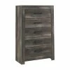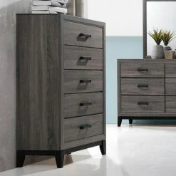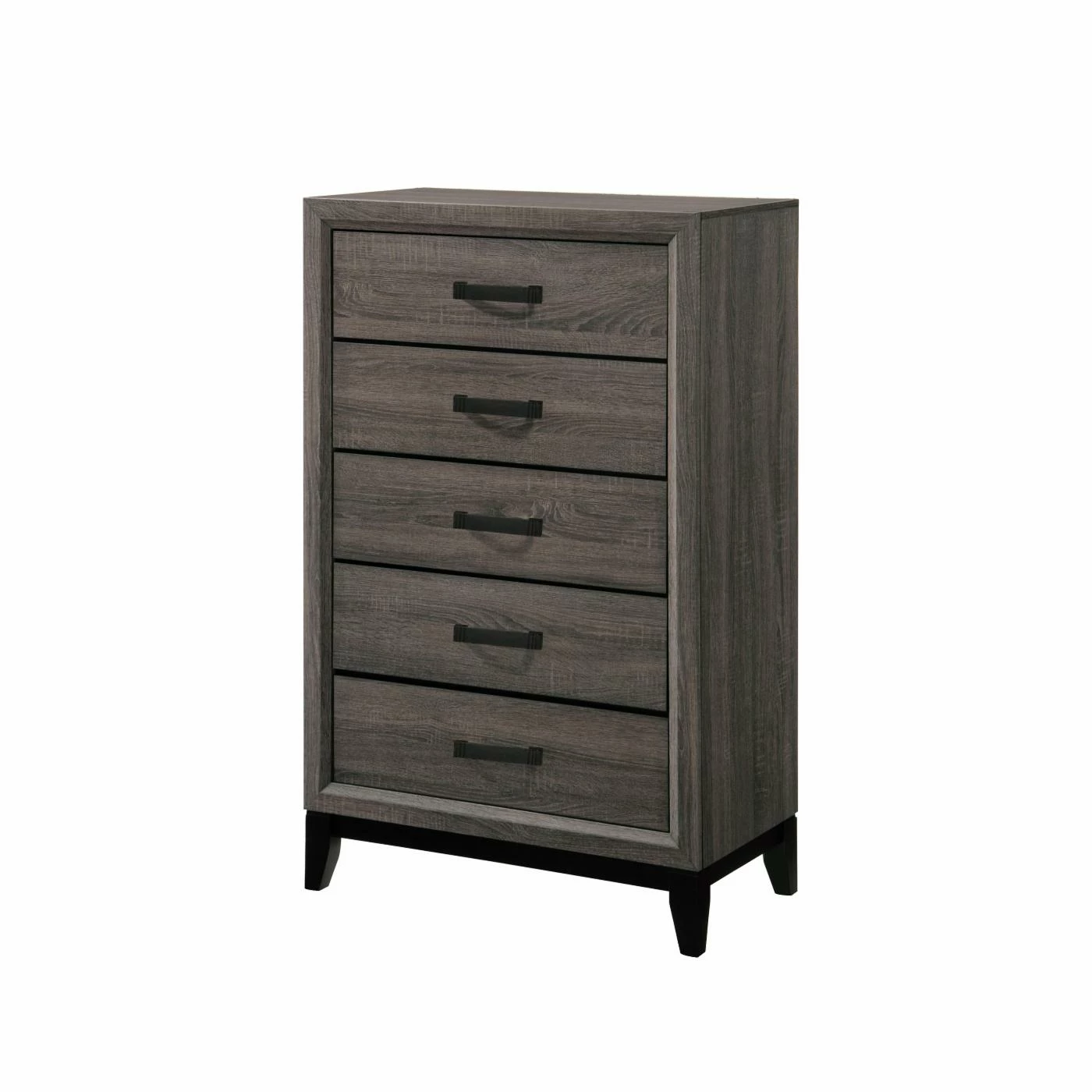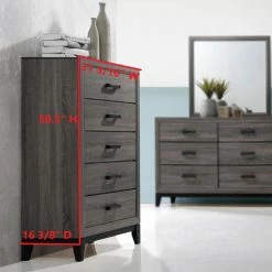 The K&B Furniture Distinctive 5 Drawer Bedroom Chest adds a rustic yet contemporary flair to your bedroom. Part of the Distinctive Collection from K&B, this chest features a solid wood frame as well as some engineered wood and wood veneers. It’s finished in a weathered gray with a black trim, super versatile to blend with other pieces and decor really well. 5 roomy drawers provide lots of storage space, and sleek black drawer pulls complete the look. Easy to assemble, this chest is a welcoming, rustic yet modern choice in furniture.