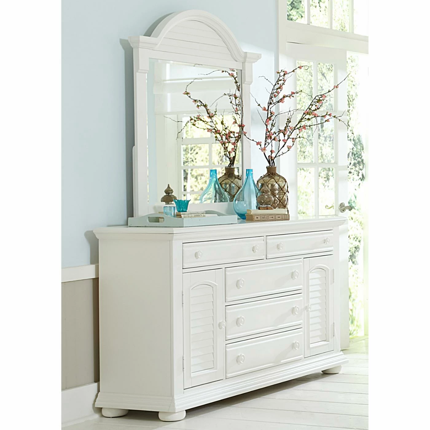 With its louvered panel doors and bun feet, this Liberty Furniture Harbor View 5 Drawer Dresser is a fresh cottage cutie. A perfect addition to your coastal-inspired bedroom, this dresser adds storage and style. It’s well-made of pine and poplar solids and comes in an oyster white finish. Storage galore lives in behind its two louvered panel doors and within the five wide drawers. The top drawer is lined in protective felt. All drawers are graced with quality French and English dovetail construction, full-extension side glides, and oversized wooden knobs. Make it complete by adding on the optional, matching mirror.