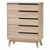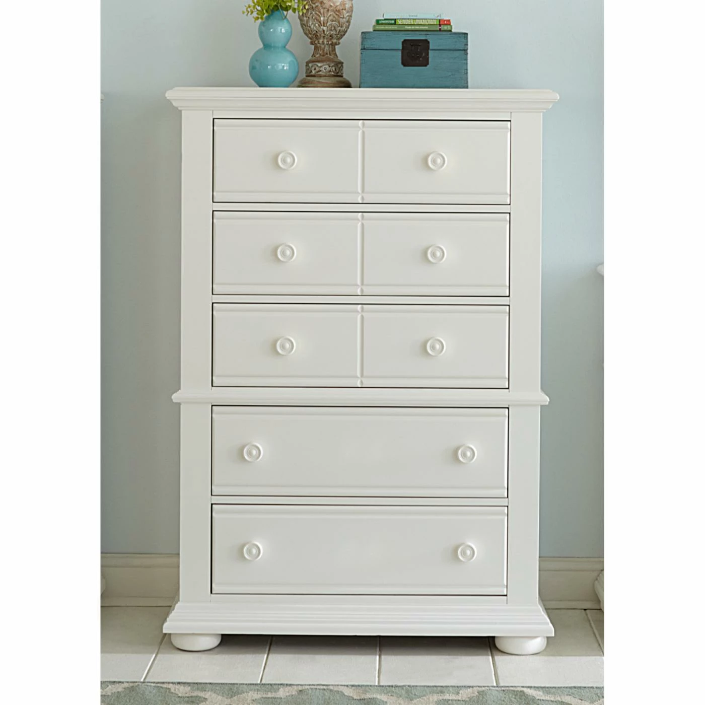 The Liberty Furniture Harbor View 5 Drawer Chest is filled with storage space and a fresh cottage vibe. A darling addition to your bedroom! This chest is crafted of pine and poplar solids with a crisp oyster white finish. It features five drawers, though the top three have faux, multi-drawer look. The top drawer is lined in protective felt. Drawers all feature premium French and English dovetail construction, full-extension side glides, and large wooden knobs. Generous moldings and bun feet add to the casual appeal.