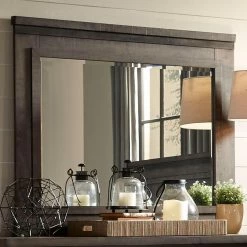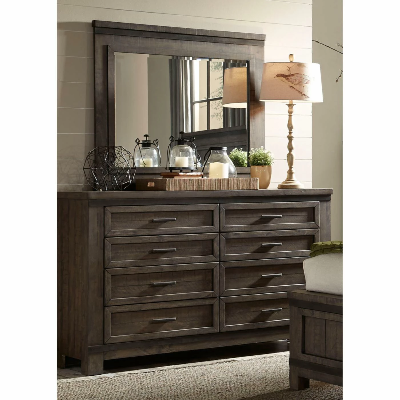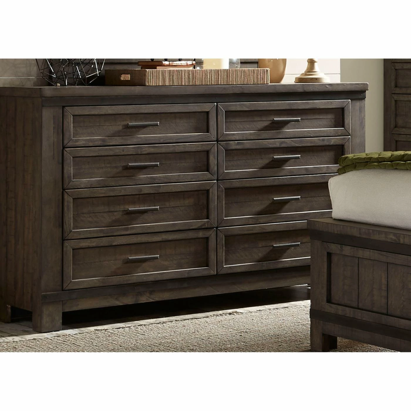 The generous Liberty Furniture Thornwood Hills 8 Drawer Dresser includes eight side-by-side soft-close drawers. French and English dovetail construction, full extension metal side glides, and hammered metal bar pulls in a dark antique pewter finish ensure smooth drawer operation. Rustic details on this dresser include panel side detailing, framed drawer fronts, and a rock beaten gray finish with saw cuts. It’s built of rubberwood solids and mango veneers.