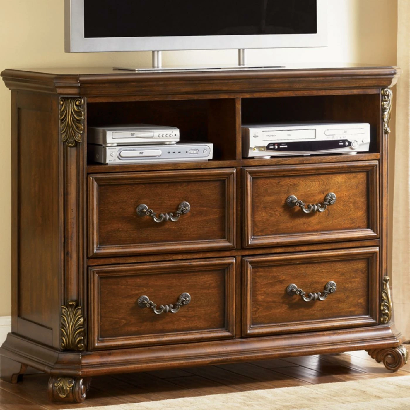The four deep drawers are fully finished inside and built with English dovetail joinery. Each of the drawers open and close smoothly due to full-extension metal drawer glides, while bottom case dust-proof panels keep your discs and game accessories dust-free. Store your favorite movies, books, remote controls, and other items within the drawers that feature antique brass bail hardware and carved acanthus leaf appliques.
