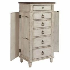 From its Old World charm to its convenient configuration, the American Drew Southbury 6 Drawer Lingerie Chest will be a new essential in your bedroom. The hinged left and right end panels on this lingerie chest open to reveals hangers for necklaces, scarves, and more. A brown jewelry tray insert in the top drawer offers even more space for jewelry, and you can use the remaining drawers, complete with soft-close guides, to store lingerie, accessories, and more. The lingerie chest combines a glazed antiqued chipped paint finish with drop-ring hardware and fluted posts to offer a style inspired by European country homes. Cedar lining in the bottom drawer and adjustable levelers complete the design.