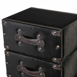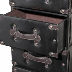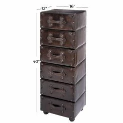 The DecMode 6 Drawer Dark Leather Lingerie Chest offers you an attractive place to keep your foldable clothes, accessories, and more safe and organized. This chest of drawers boasts six trunk-like drawers stacked neatly atop one another. The drawer faces come with leather strap handles and metal studs. Hardy medium-density fiberboard is used to craft the piece, topped by a deep brown polyurethane leather upholstery.