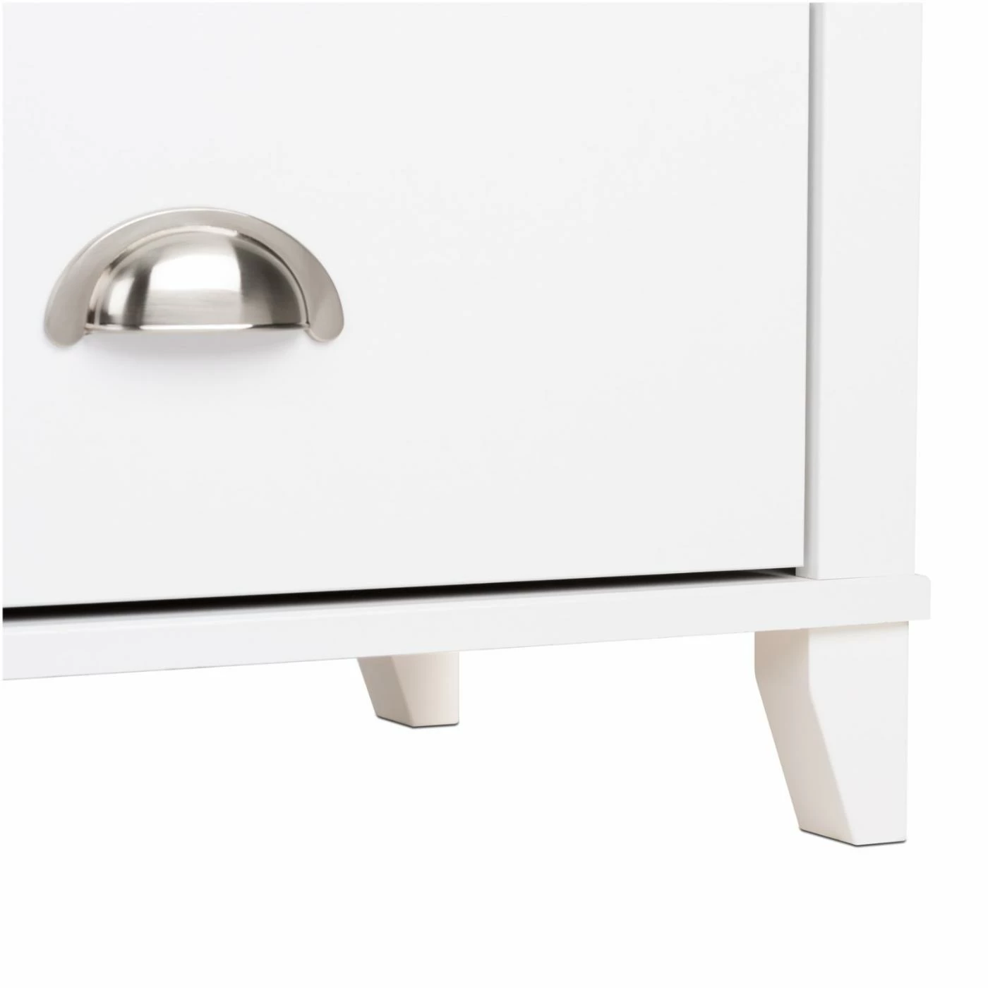 - Brushed nickel hooded pulls and tapered legs add a sophisticated look
