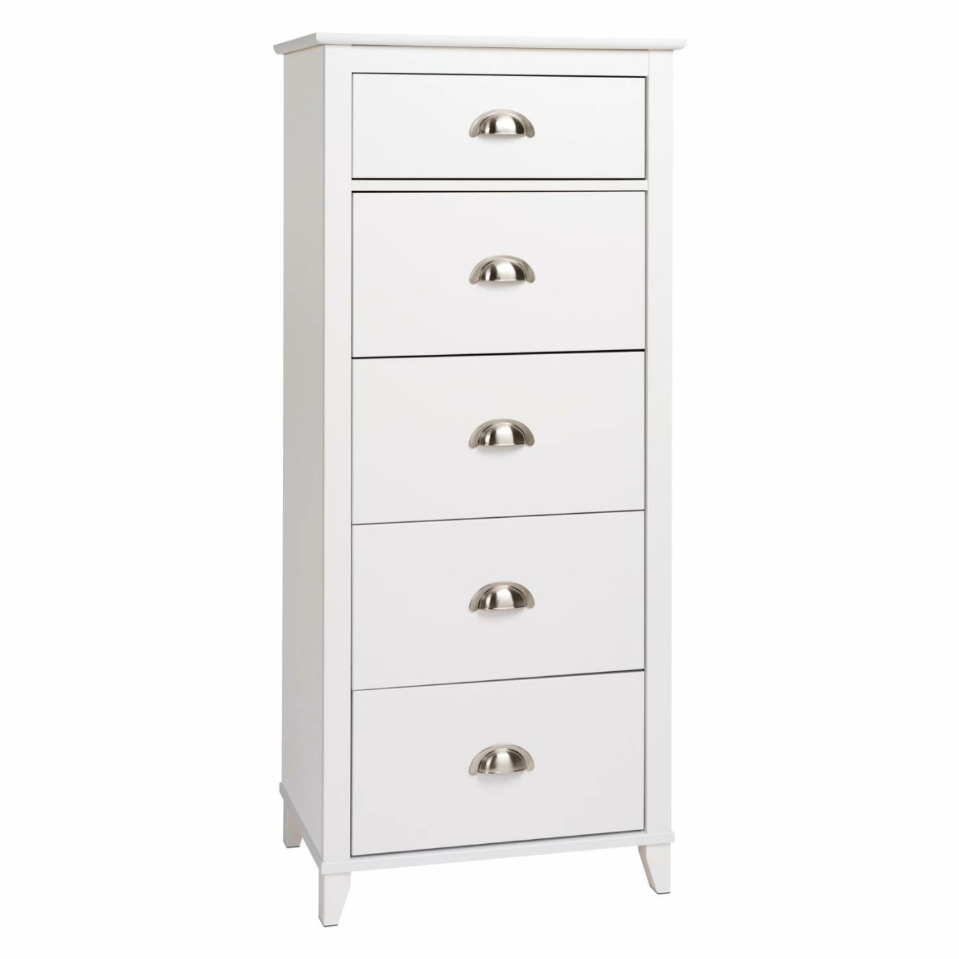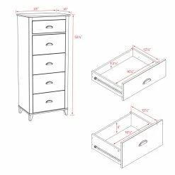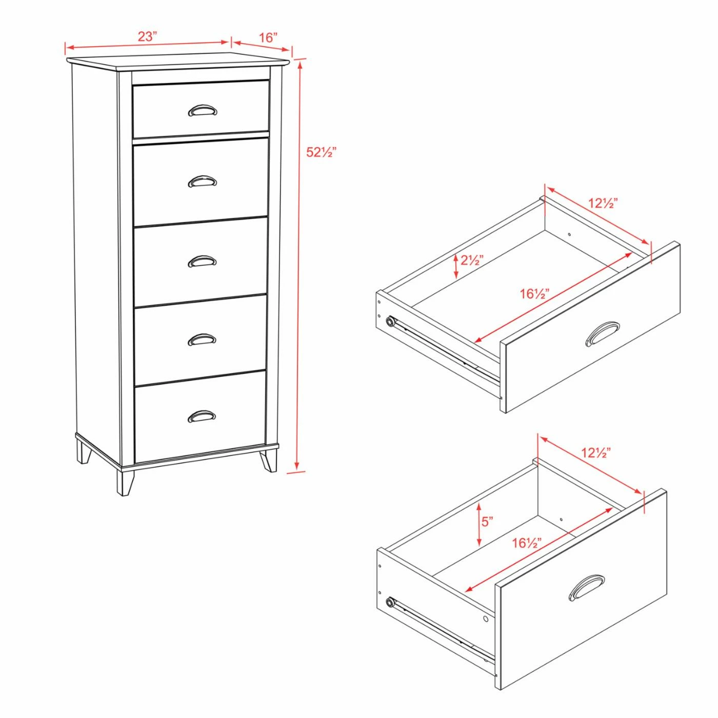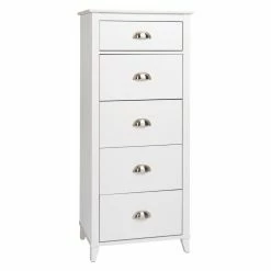 This Prepac Yaletown 5-Drawer Tall Chest is a necessary part of every bedroom. Crafted from CARB-compliant composite wood, this dresser features brushed nickel hooded pulls and tapered wood legs for a sophisticated look. A smaller, separated drawer lets you organize your smaller necessities. This dresser works as a standalone piece or as part of a larger set.
