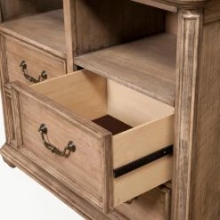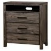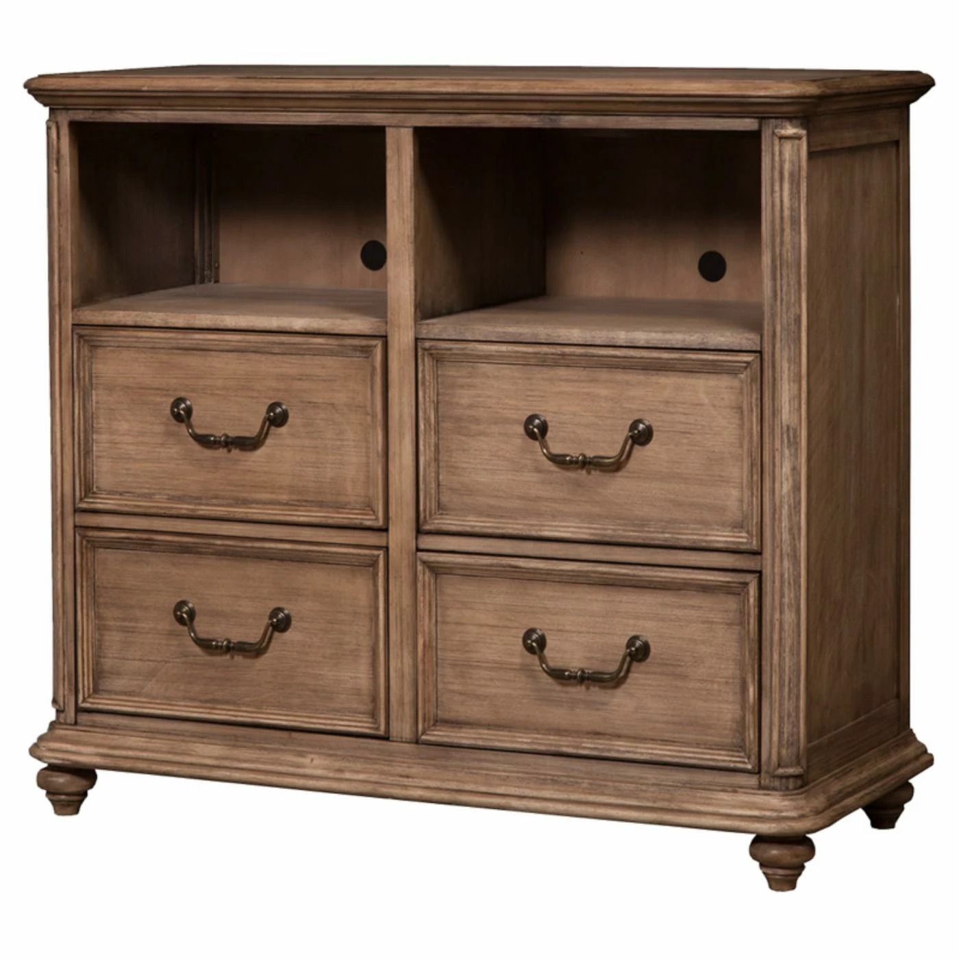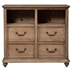 Classically designed yet with an eye to the future, this Alpine Furniture Melbourne 4 Drawer TV Media Chest fits your lifestyle beautifully. Traditional design features include picture frame drawer moldings, turned bun feet, and decorative metal bail pulls. The spacious top provides plenty of space for your TV and the two media openings below are just right for electronic components. Each even includes a wire opening to keep things tidy. Traditional storage can be found in the four drawers below. A felt-lined top drawer offers protection. Drawers are built with English and French dovetail construction and have ball bearing metal glides. This media chest is crafted of plantation-grown mahogany solids and okoume veneers in a French truffle finish with light wire brush accent.