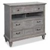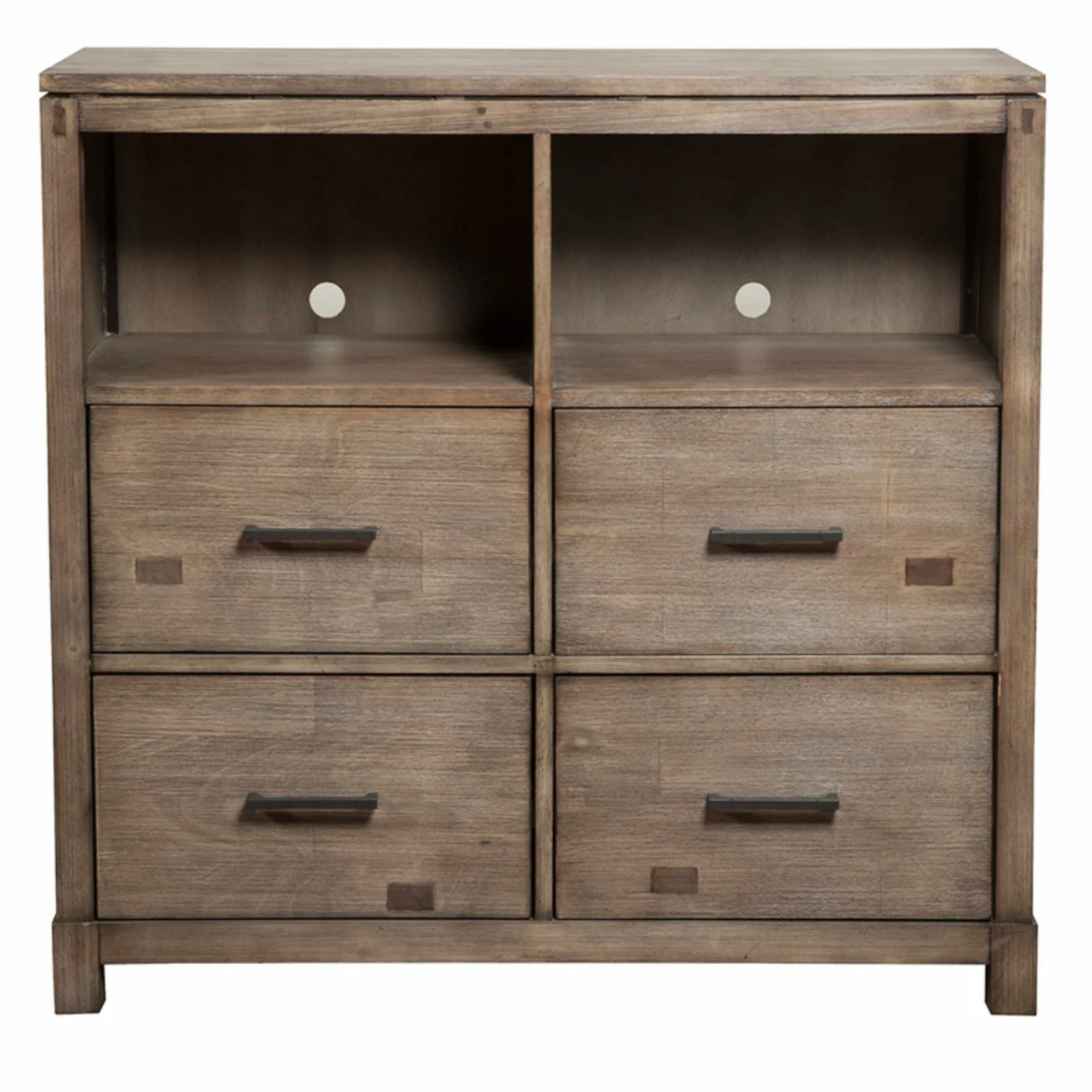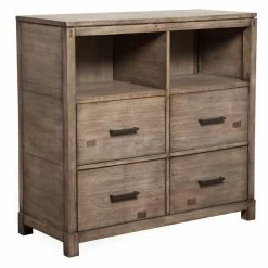 House your TV and media gear in the rugged Alpine Furniture Sydney 4 Drawer Media Chest, a chest built tough with humidity-resistant engineered wood and stunning okoume veneers. The weathered gray finish is lightly wirebrushed, and four drawers are at your service for holding media collections, clothing, and more. Ball bearing metal glides keep the drawers running smoothly for a long time to come. Open shelves are fitted with cable management holes.
