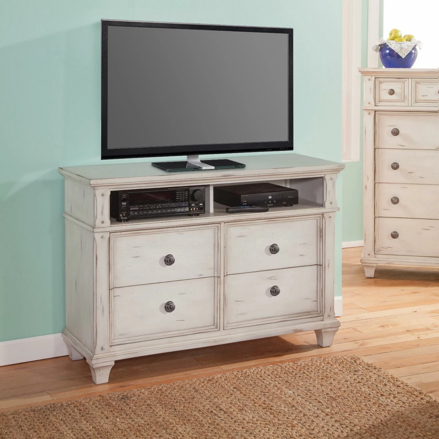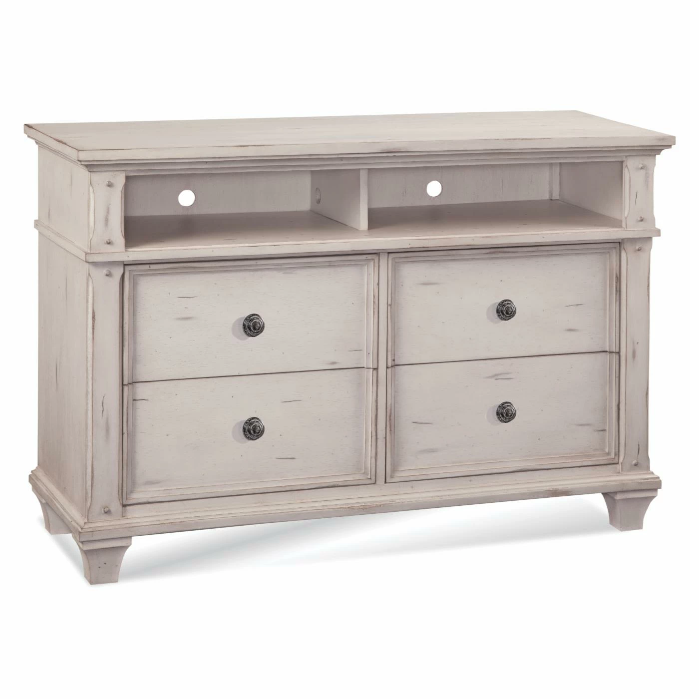 Just because you’ve embraced a rustic style like shabby chic or urban farmhouse doesn’t mean that you can’t have a fully appointed media center like the American Woodcrafters Sedona Vintage Media Chest. This durable piece has an old-school look that’s going to fit all the hardware for a 4K, next-gen experience. This elegant media console has a wide top that’s designed to fit flat-panel TVs up to 57 wide. The body of the console is made from sengon tekik hardwood with an exterior of high-quality mahogany veneers. Carved pilasters and framed drawer faces give it a classic charm, but the distressed finish really sells that vintage style. A distressed finish in antique white has rub-through highlights that really achieve the look of a well-loved piece of furniture. A pair of open storage compartments give you room for the cable boxes and consoles that make our entertainment systems work. Down below you have deep drawers that are perfect for media and the remotes for all your components. Each drawer features traditional English dovetails with full-extension, ball-bearing glides.