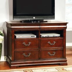 The Grand Central 4 Drawer Media Chest – Cherry is traditionally elegant yet conveniently modern in its features. Today’s master suites are more than simple bedrooms, which makes this media chest perfect. It’s built heirloom-quality from solid wood and veneers and has a luxe brown cherry finish. the four soft-close drawers have center metal glides, spacious interiors, and antiqued metal bail pulls. Two media openings and the generous top are there to house your bedroom theater in style.