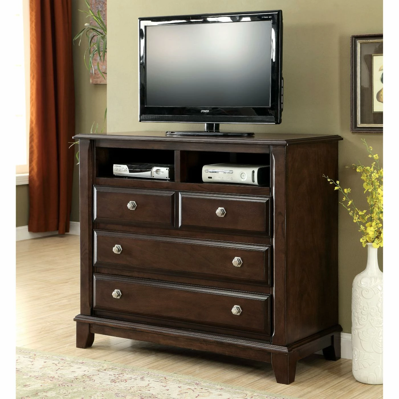 With the Furniture of America Millard 4 Drawer Media Chest you can watch TV in bed and have extra storage space. This media chest accommodates up to a 46-inch flat screen TV on top and features two media openings plus cord management holes for electronic components. For traditional storage, it features two smaller and two wide drawers with raised, beveled fronts and hexagonal pulls in silver. A rich and versatile brown cherry finish gives this media chest its contemporary appeal.