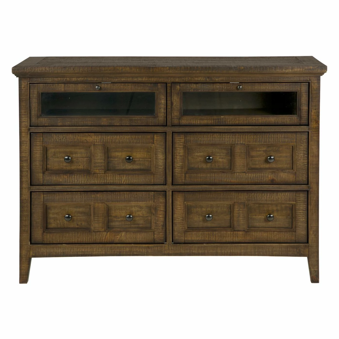 Perfect for a family gathering space or your cozy master suite, the Magnussen Bay Creek Relaxed Traditional Toasted Nutmeg Media Chest features plenty of storage for movies, music, and more. Two top doors with glass windows are perfect for small electronics like DVD players, and each drawer is accented with aged bronze hardware. Details like shaker legs, framed panels on the drawers, and a warm toasted nutmeg finish will make this media chest a household staple.