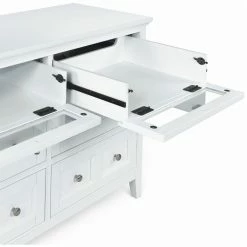 The Kentwood Media Chest gives you the storage you seek and a stylish design you’ll love. Featuring a bright and cheerful white finish, this media chest features a sturdy flat top for TV placement (up to 55 inches wide). Two drop-down drawer fronts make it easy to access and store your DVD player, stereo components, gaming console, or other electronics. Four drawers with brushed-nickel pulls hold your DVDs, CDs, and more. French and English dovetail construction make the drawers extra strong, while full-extension metal side guides make opening and closing them easy. For a cohesive look, pair this charming media chest with other items in the Kentwood collection.
