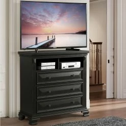 The Picket House Furnishings Trent 3 Drawer Media Chest perfectly balances modern function and aesthetics with traditional charm. This piece features carved pilasters, raised details and trim molding around beveled drawer faces. Three drawers offer storage beneath an open storage compartment that’s ideal for cable boxes, gaming controllers, or AV equipment. The upper drawer is lined with black velvet and the lower drawer is dust-proof and constructed with cedar lining to ward off insects. The body of this piece is crafted from a mix of solid acacia and pine hardwood with engineered wood elements, all in your choice of available finish option. An anti-tip kit is included.