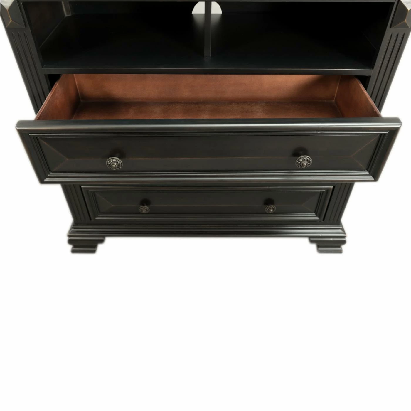 - Felt-lined top drawer and cedar-lined, dust-proof lower drawer