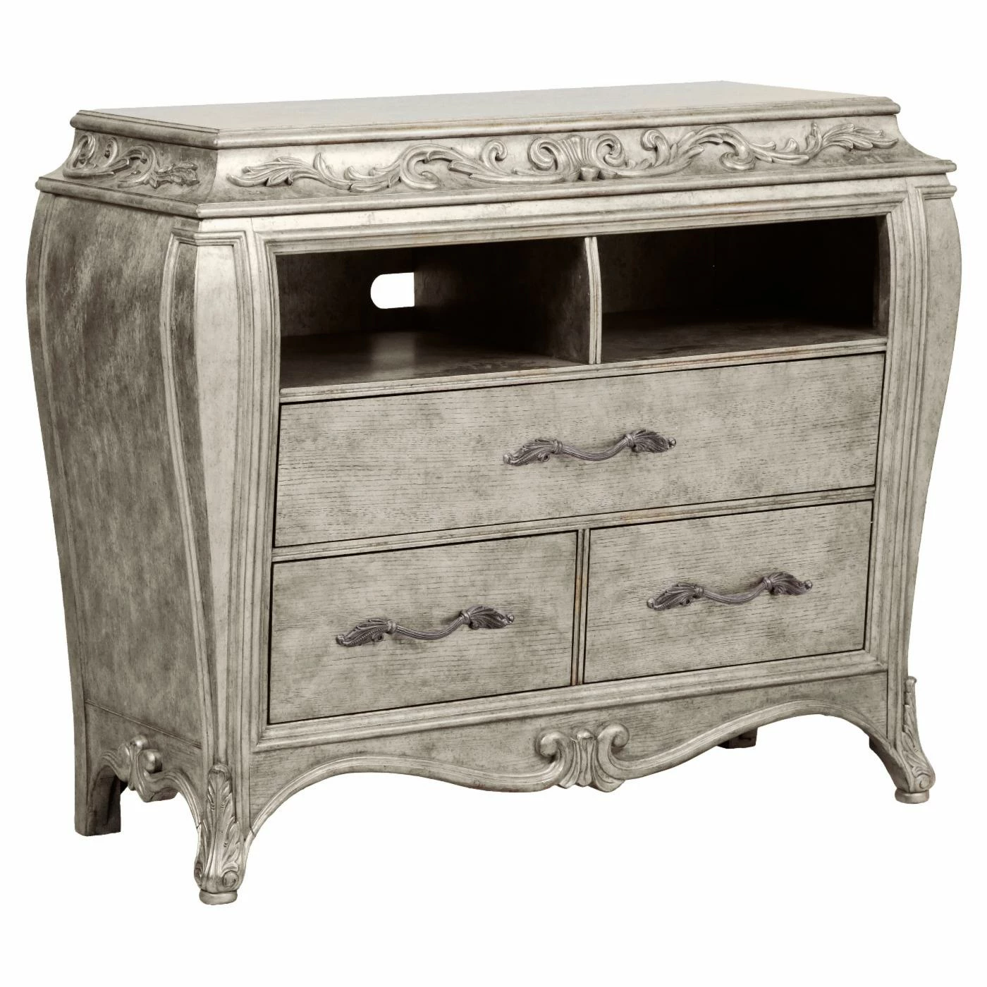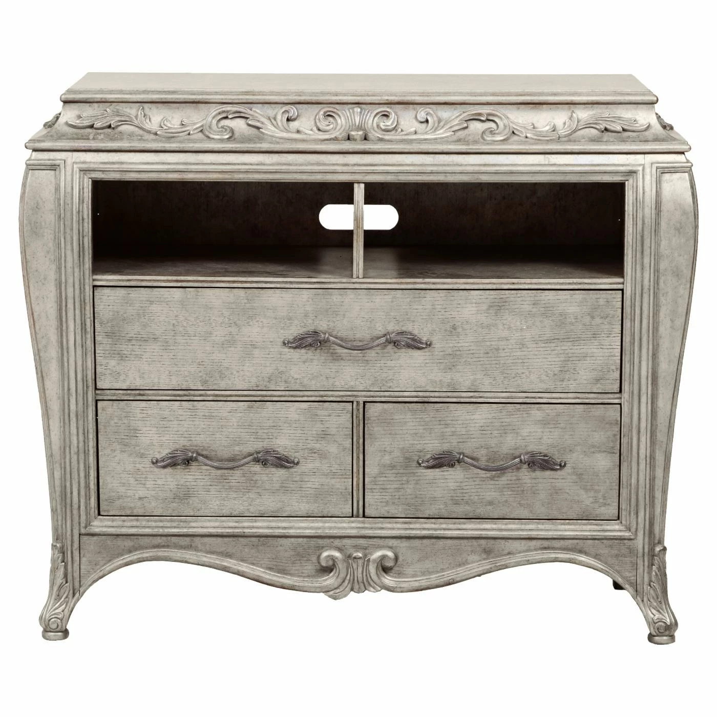 Defined by sensual curves and intricate leaf on-lays and hardware, the Pulaski Rhianna 3 Drawer Media Chest stands as a gorgeous centerpiece for all of your home entertainment needs. The French-inspired design gives this sumptuous chest a sense of grandeur that will make all youβre a/v components and that HD television of yours look even more impressive. The media console is crafted from durable plantation hardwood and quartered ash in a metallic silver finish that adds a touch of glamor to your space. Its three French and English dovetail drawers are wonderful for organizing movies, music, and games, and there are to open alcoves with a cord management back panel that makes setting up a DVR or gaming console simple. Some assembly is required.