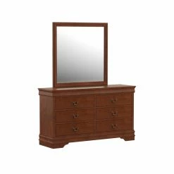 Practical grace, the Hayworth 6 Drawer Dresser with Mirror – Brown is a stylish way to store and add beauty to your bedroom. Made of durable rubberwood in a warm brown finish, the dresser is finished with brushed silver bail pull hardware. The matching wood framed mirror has simple lines and a beveled mirror that reflects the same traditional style and makes it easy to get ready for the day.