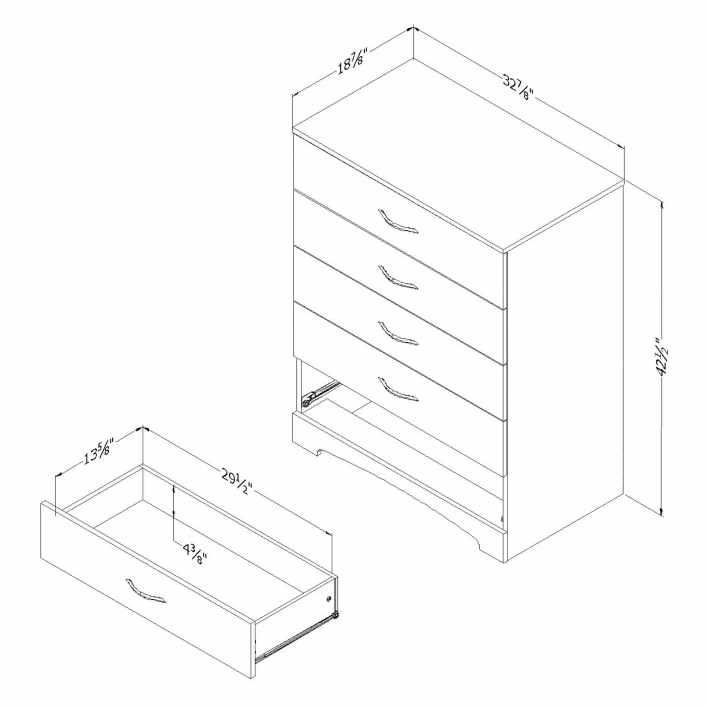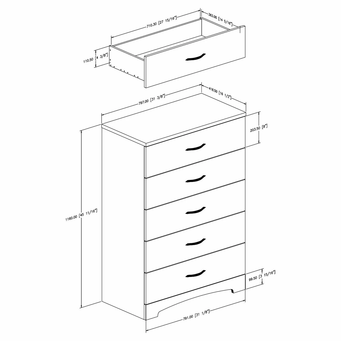 - 5 drawers with metal slides and brushed nickel-finished metal knobs