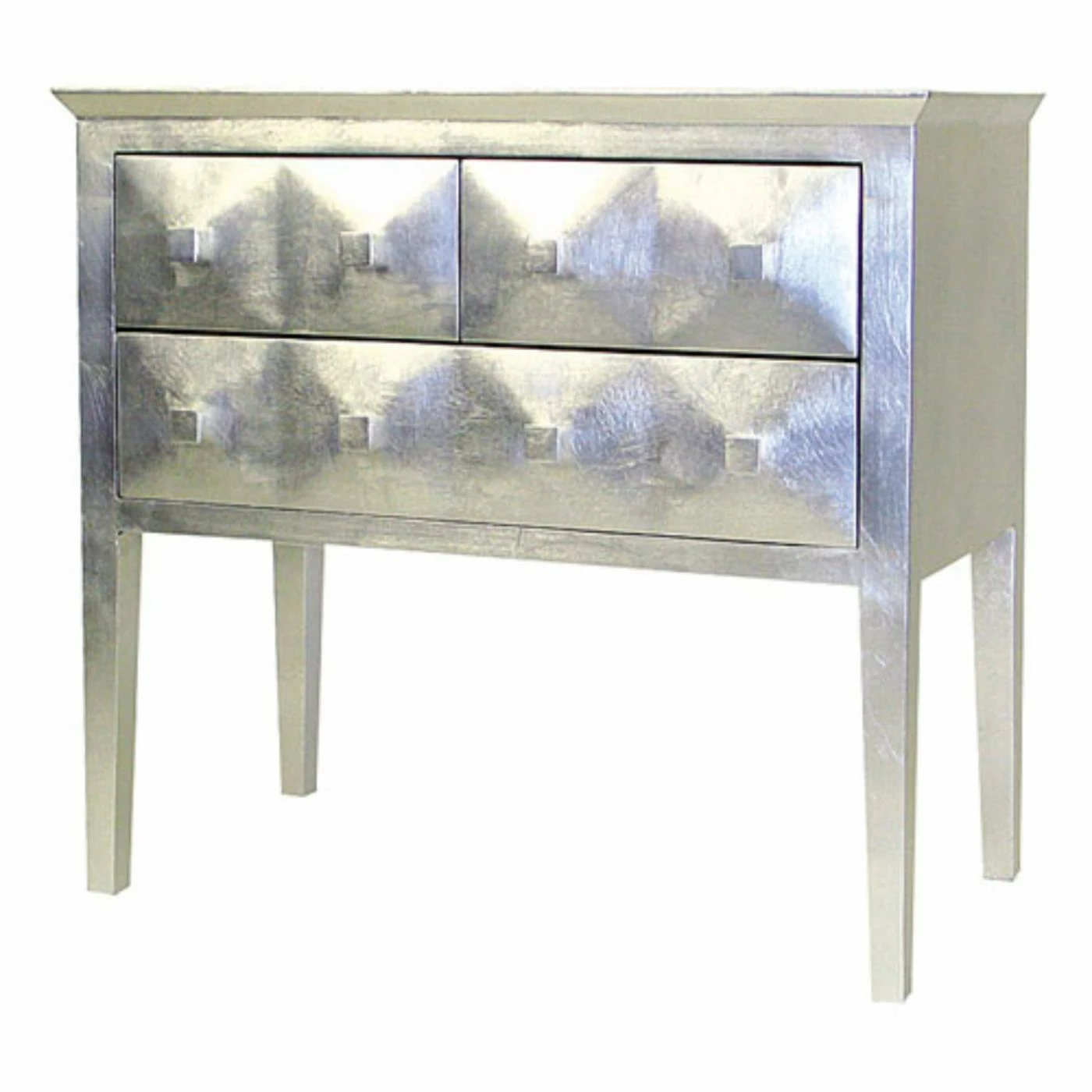 The Vanderbilt 3-DrawerΒ ChestΒ comes in an eye-catching silver finish and is the perfect accent to any home decor. This functional, small dresser orΒ console is constructed with a wood veneer and features three-drawer construction with one larger bottom drawer and two top drawers, all with metal pull knobs. The attractive, contemporary design of the chest is sleek, modern and stylish, and the square cut legs complete the attractive look. Dimensions: 31W x 16D x 29H inches.